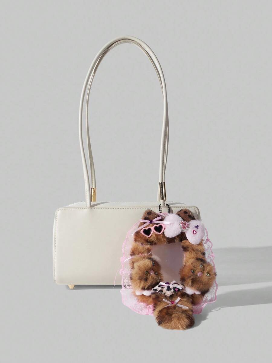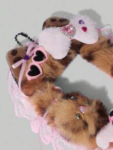Furry Leopard Print Pink Bow Heart Rhinestone Lace Flower Bag Charm, Casual Fashion Anime Style Multi-Purpose Card Holder (ID Card, Photo, Etc.)