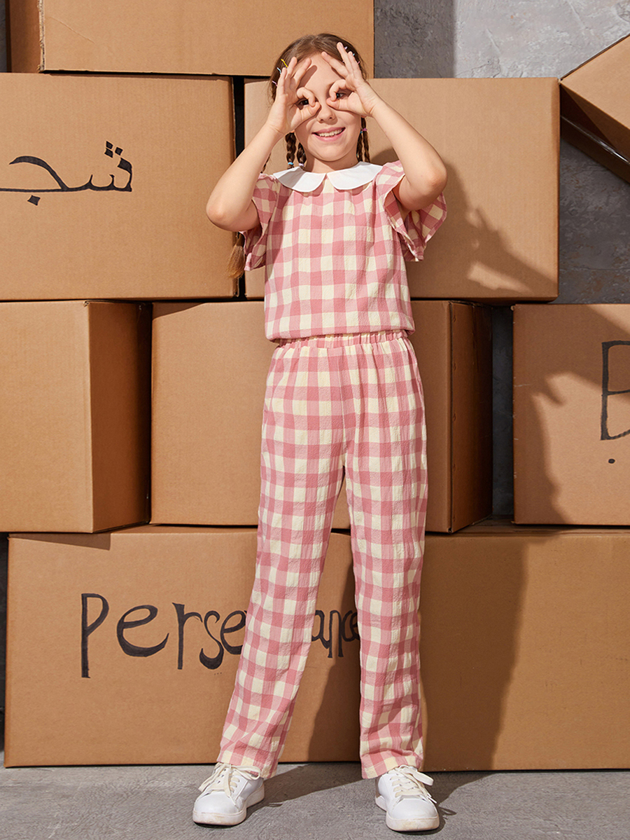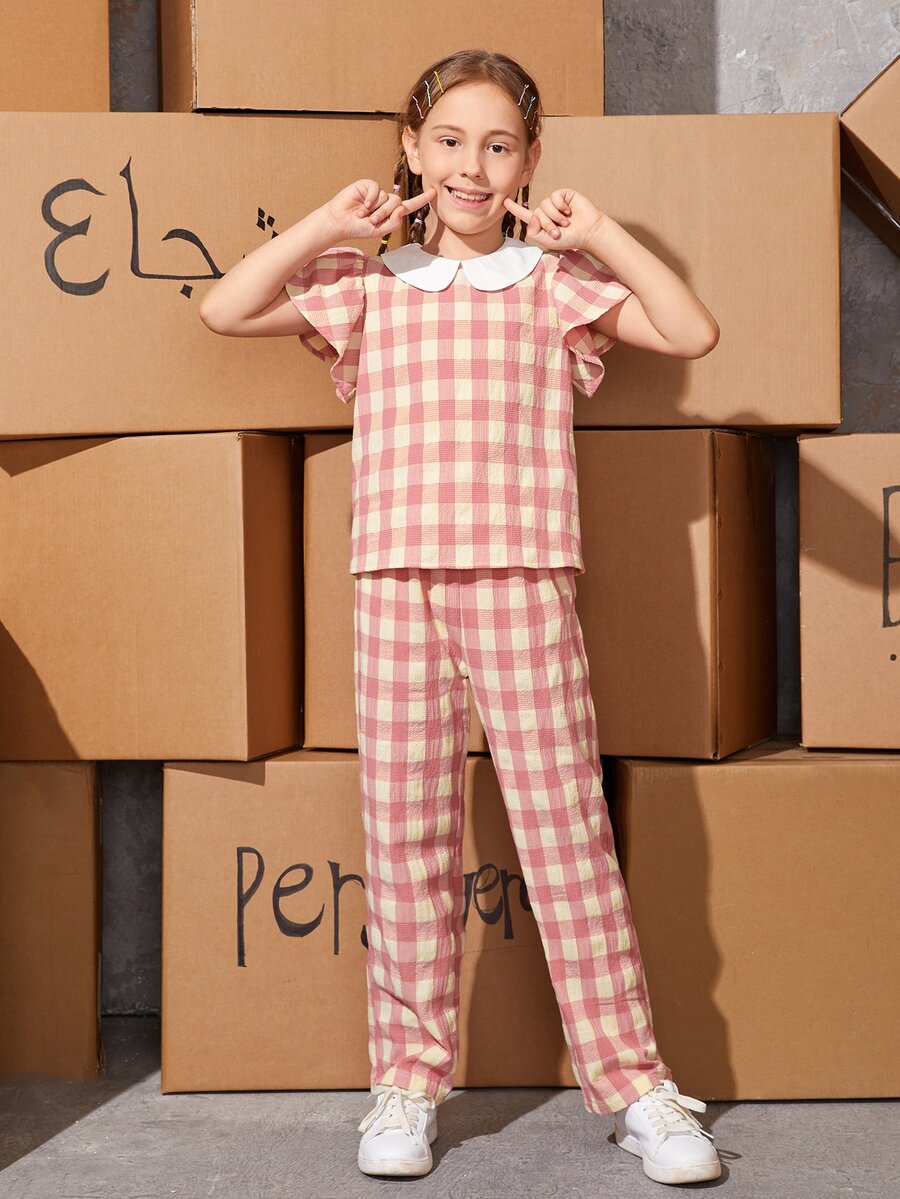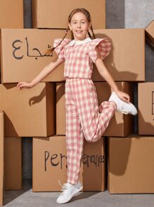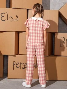 Girls Gingham Exaggerated Sleeve Top & Pants Set