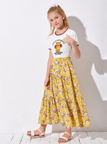 Girls Letter & Animal Print Ringer Tee and Skirt Set