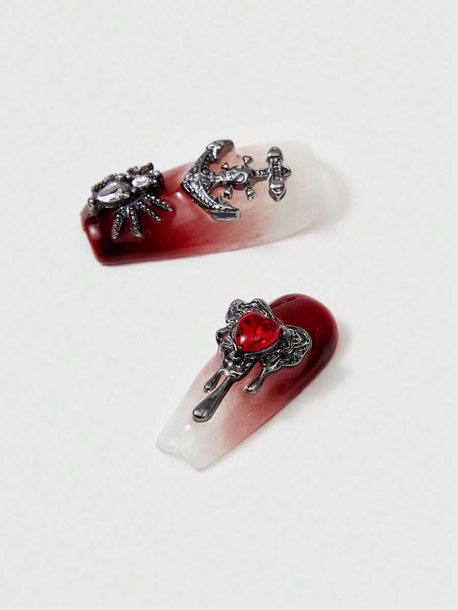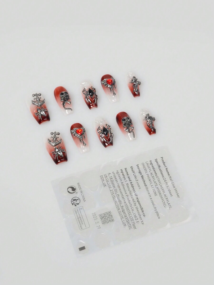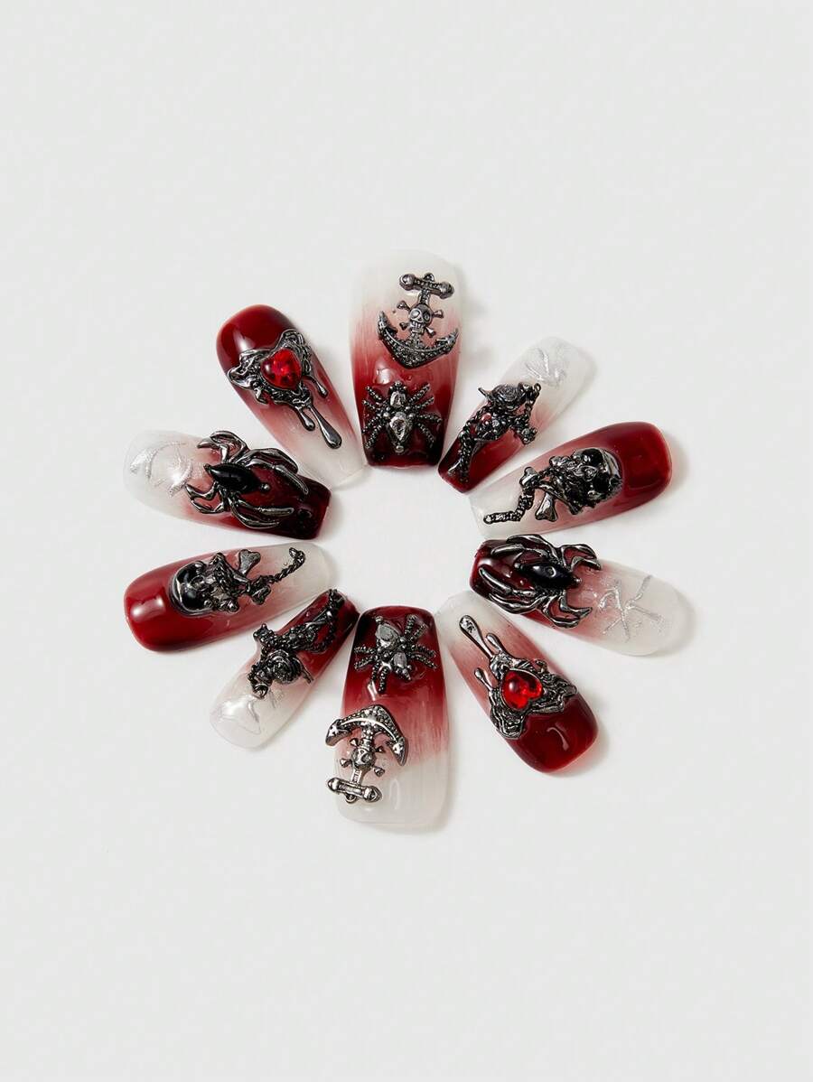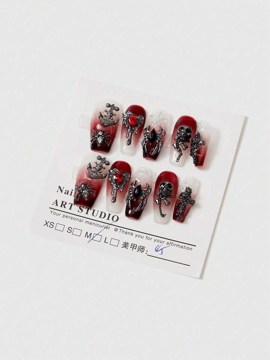 Goth 10pcs Long Coffin Rhinestone Decor Fake Nail Kit