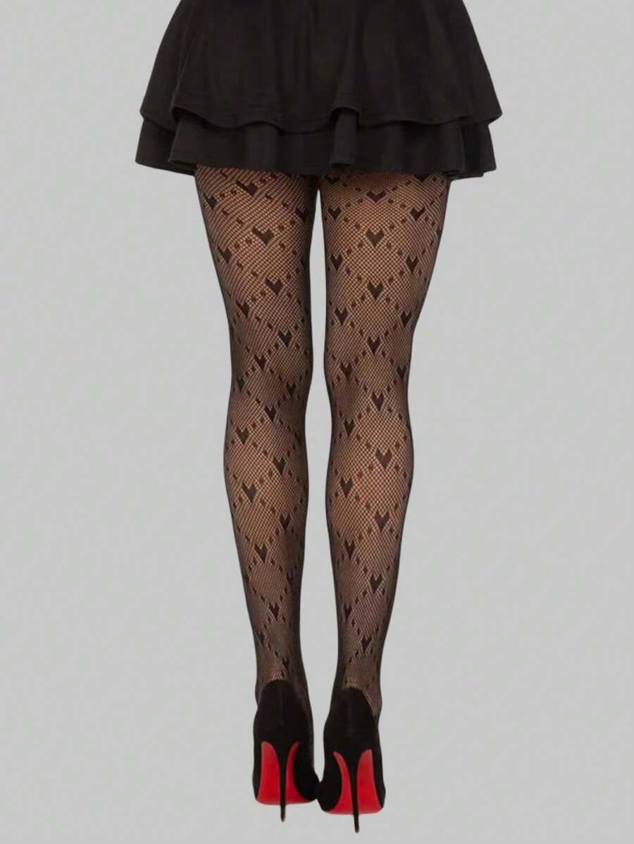 Goth 1pair Women's All-Season Black Heart & Rhombus Pattern Fishnet Stockings For Valentine's Day