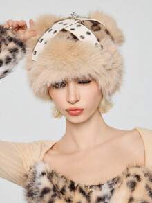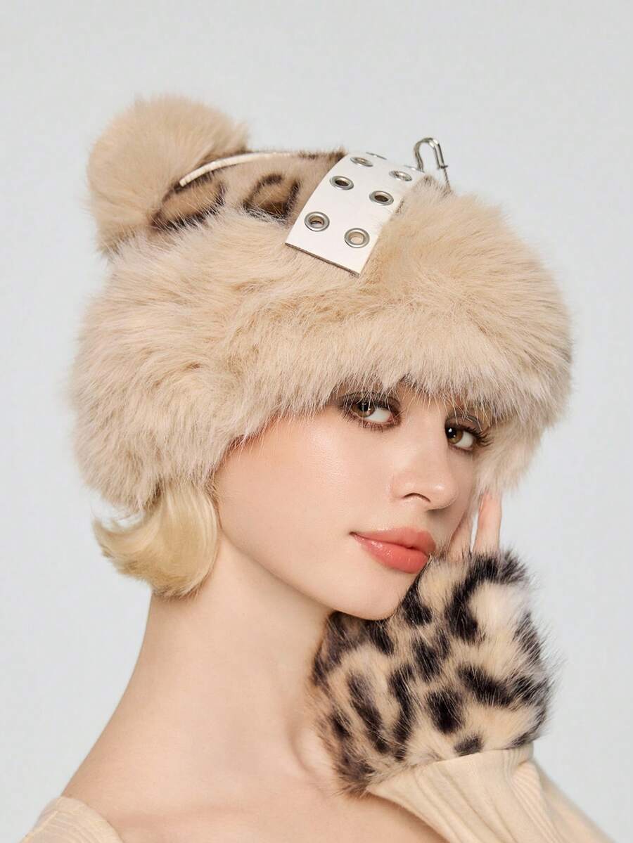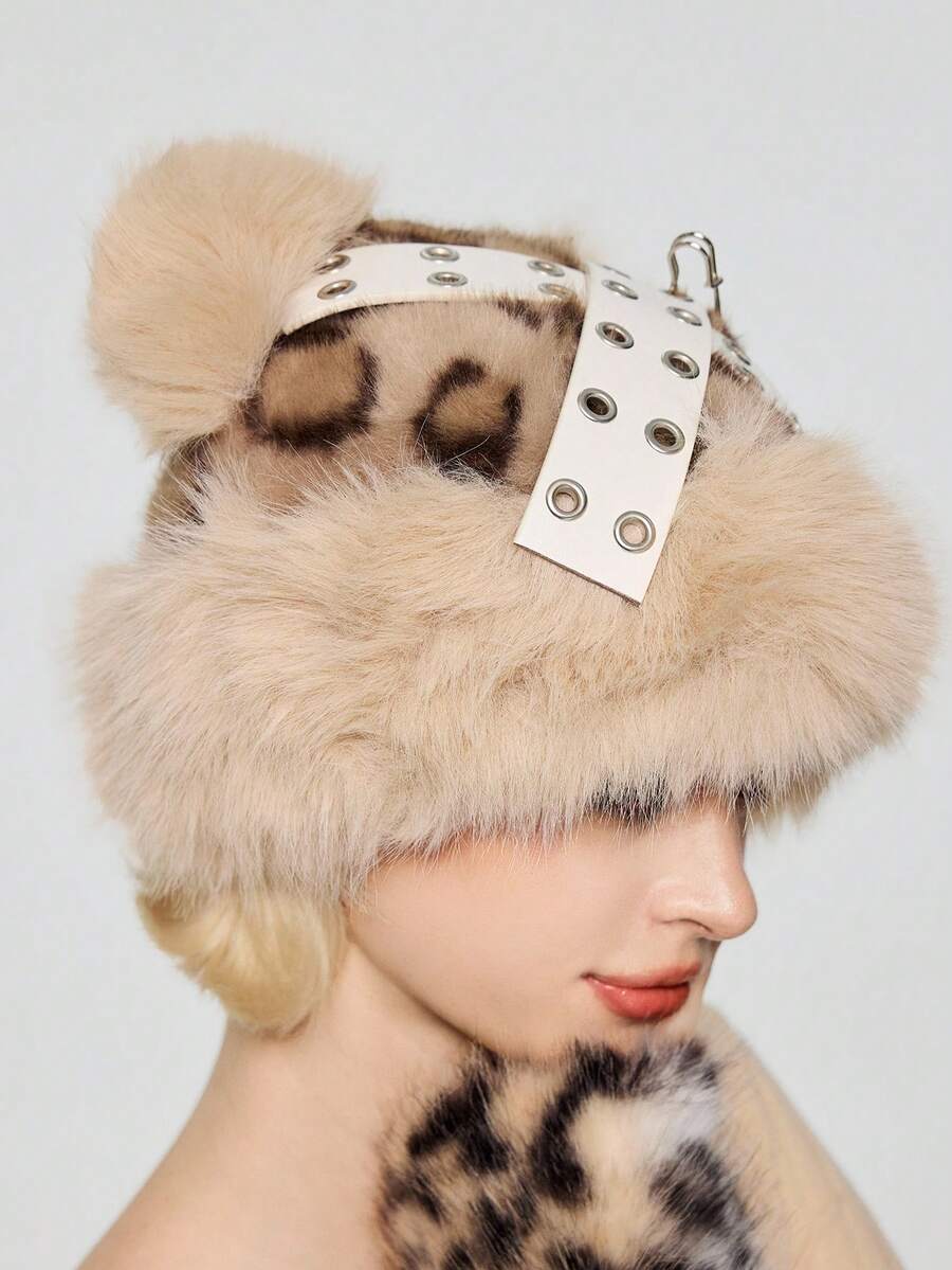 Goth 1pc Gray Faux Fur Leopard Print Animal Pattern Faux Fur Ear Patch Rivet Decor Design Warm Bucket Hat, Y2K Fashion Minimalist Retro Punk Unisex Warm Accessory, Suitable For Daily, Campus, Date, Shopping, Etc.