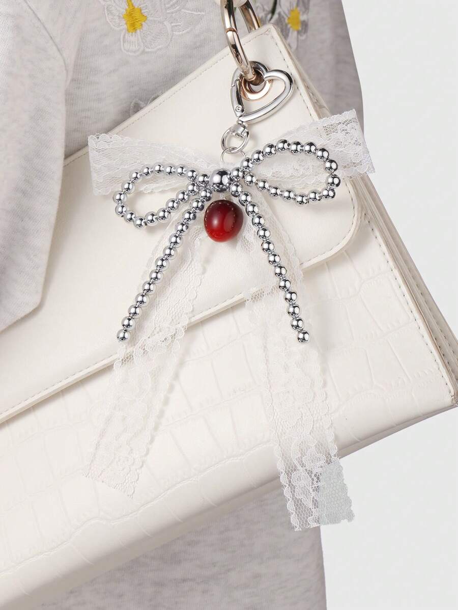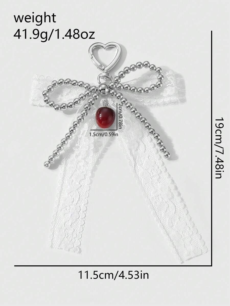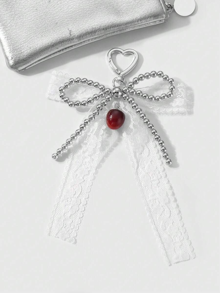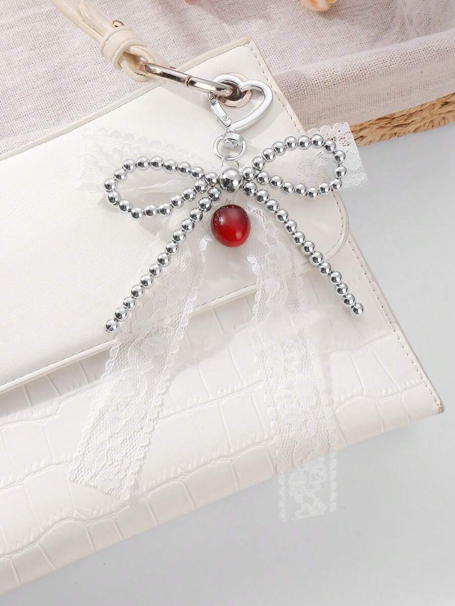 Goth 1pc Y2K Fashion Versatile Delicate High-Quality Handmade Beaded CCB White Lace Bow Imitation Cherry Pendant Keychain Bag Charm, Suitable For Women Daily Wear, Holiday Gift