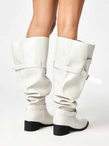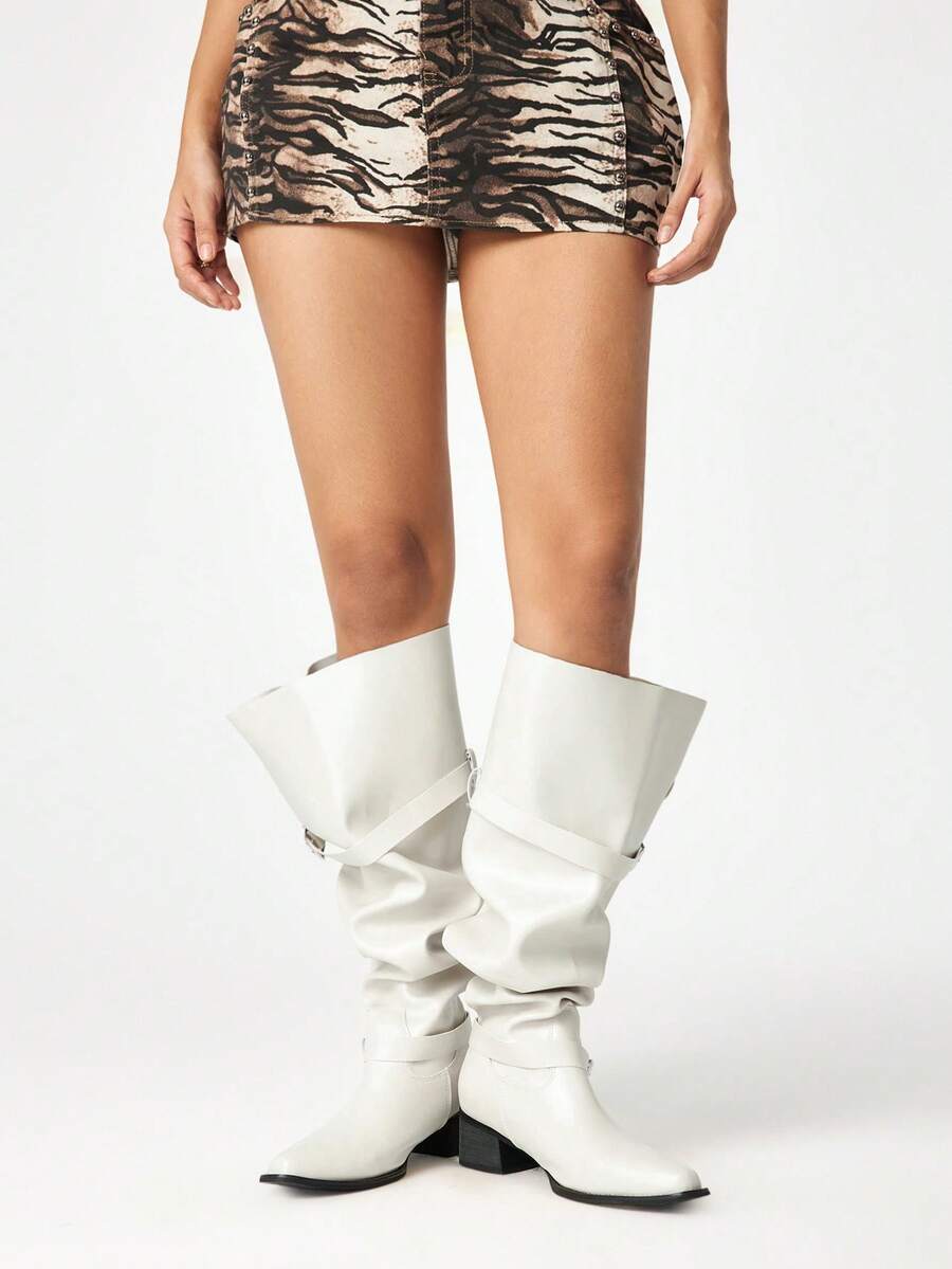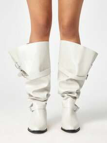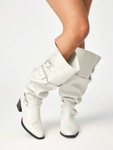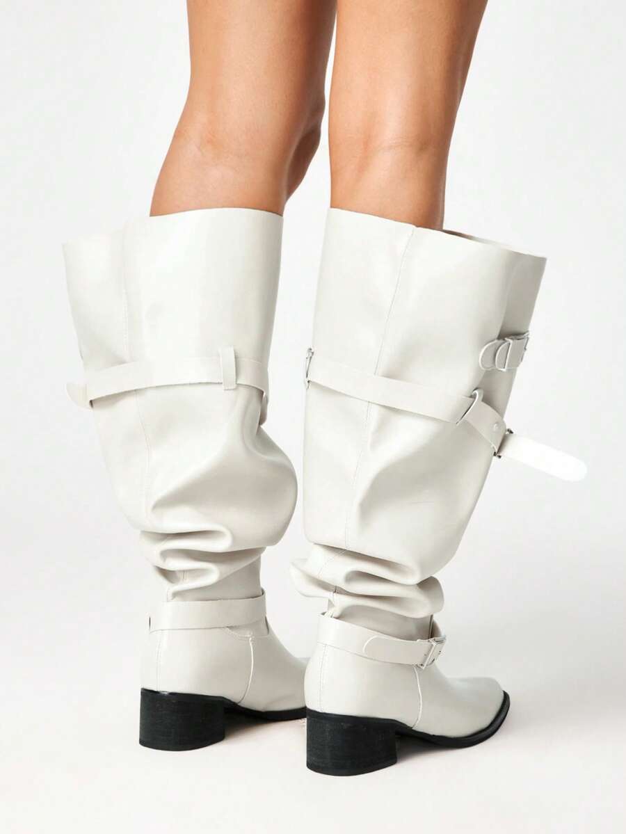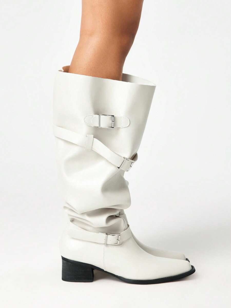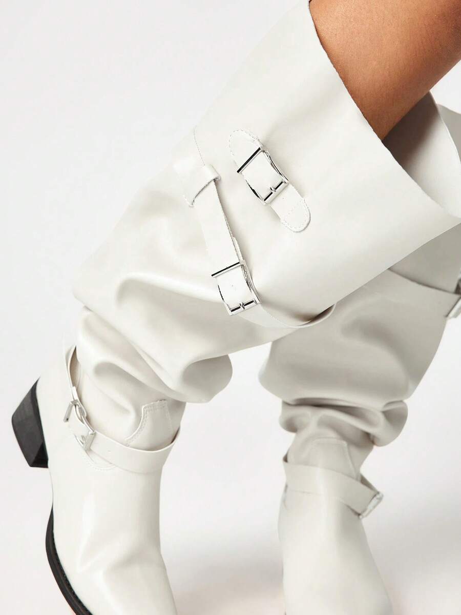 Goth 2025 New Fashion Pointed Toe Thick Heel PU Leather Buckle Strap Thigh High Boots, Suitable For Autumn/Winter