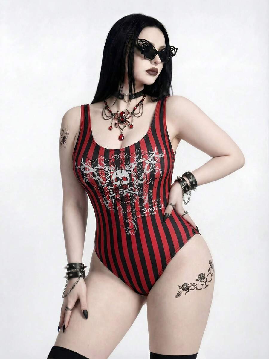 Goth 2026 New Plus Size Women's Red And Black Striped One-Piece Swimsuit, Skull Print Personality Slimming Swimwear, Dark Punk Style Attractive For Photo Shoot, Hot Spring Party