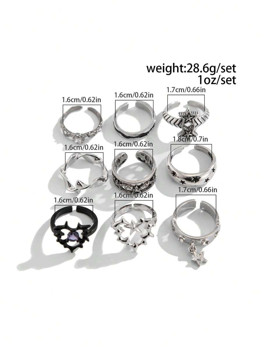 Goth 9pcs/Set Fashionable Casual Punk Hollow Star & Heart Shaped Rings, Ideal Gifts For Holidays