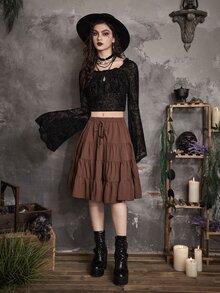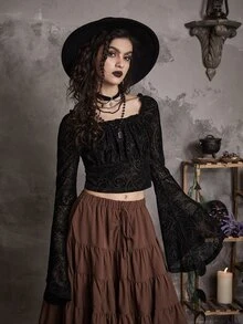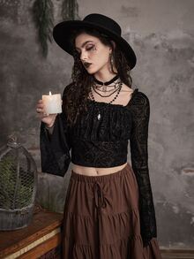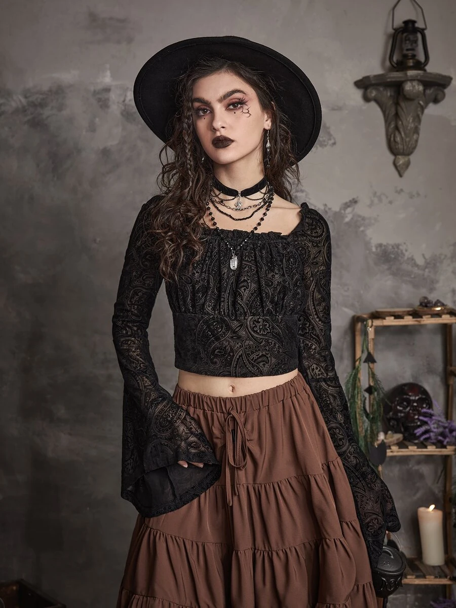Goth Allover Paisley Print Flounce Sleeve Crop Top