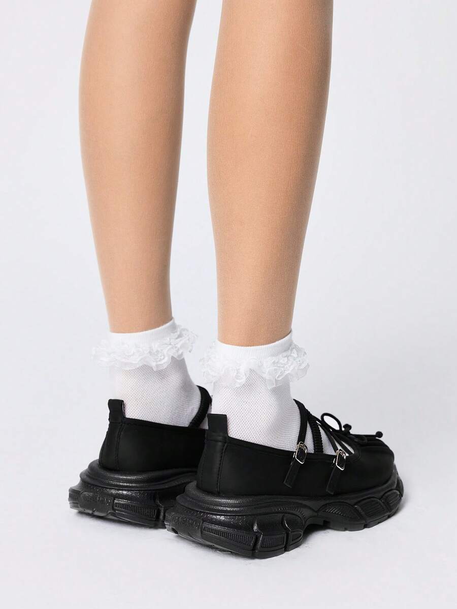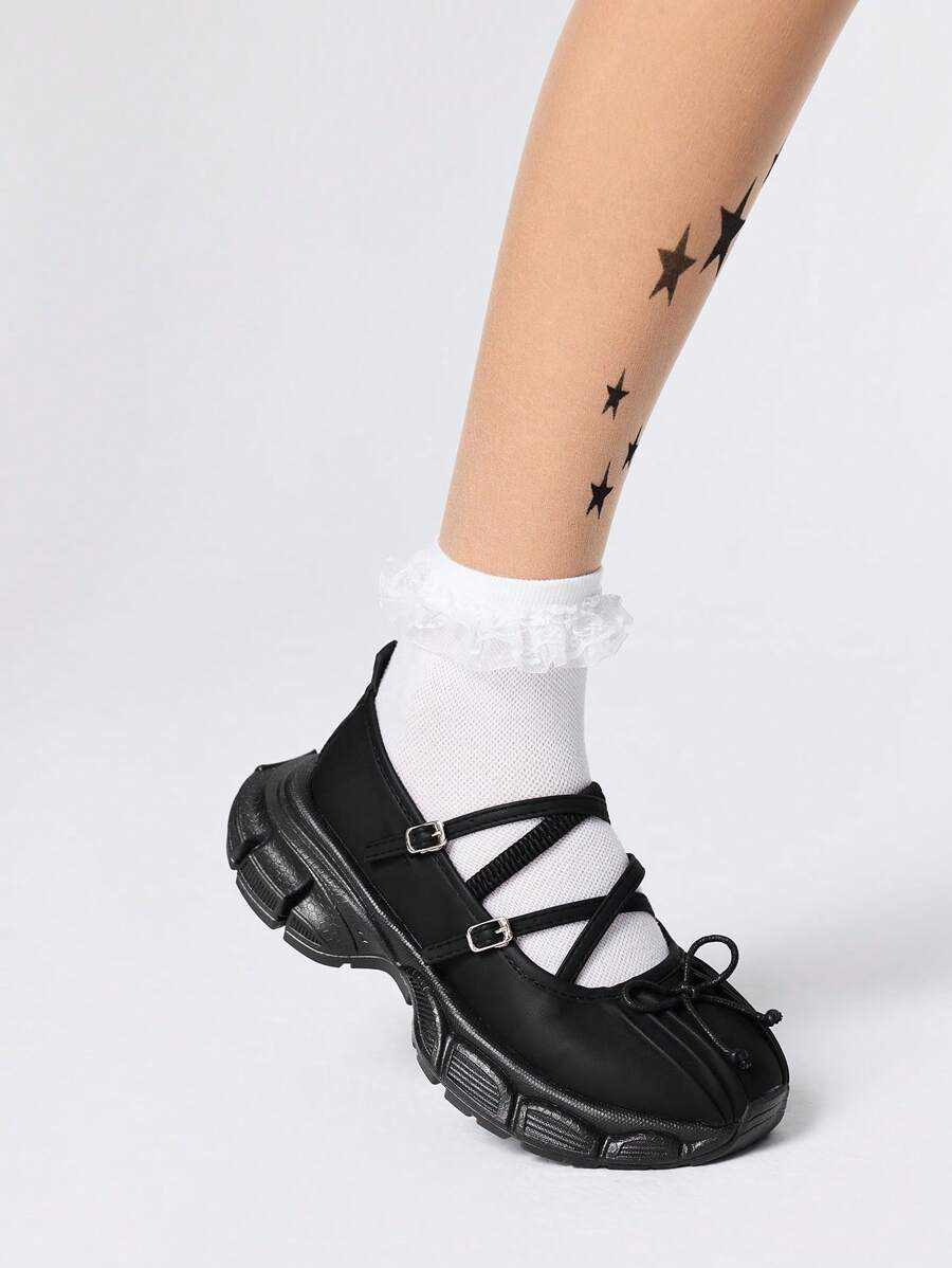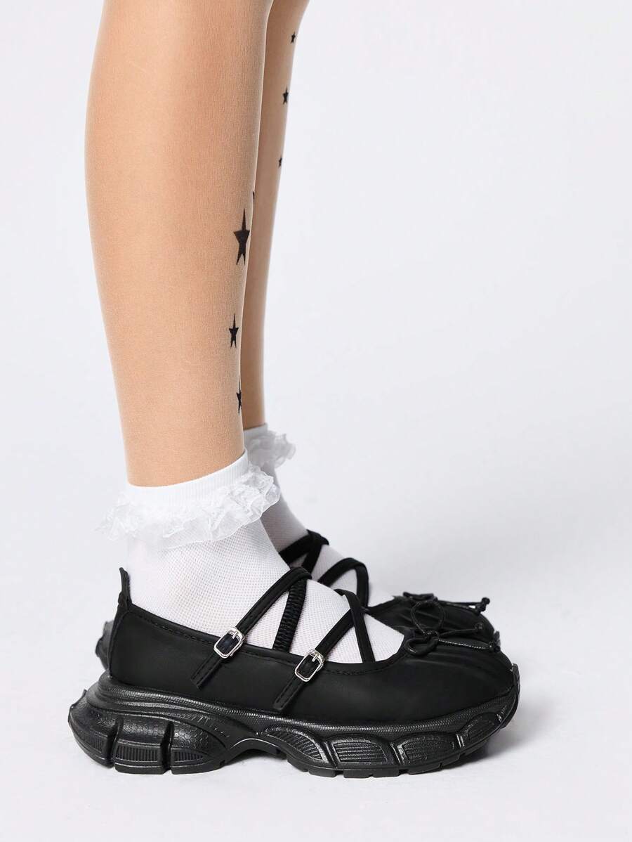 Goth Black Leather Ballet Flat Princess Shoes, Retro Campus Style Thick Sole Loafers With Bowknot, Versatile Casual Shoes