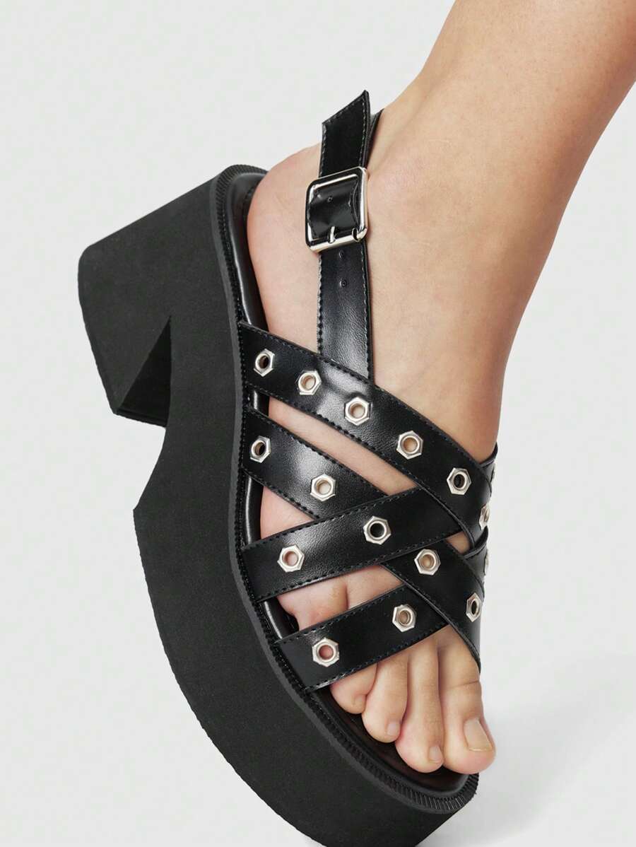 Goth Black Punk Style Round Toe Platform Wedge Sandals, Multi-Strap Design, PU Leather Material, Suitable For Graduation Photos & Workwear Spring Shoes Spring Break Easter