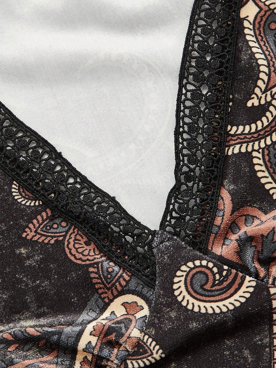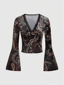 Goth Boho Style Paisley Printed Velvet Women'S T-Shirt With Flared Sleeves, Deep V-Neck And Slim-Fit Waist