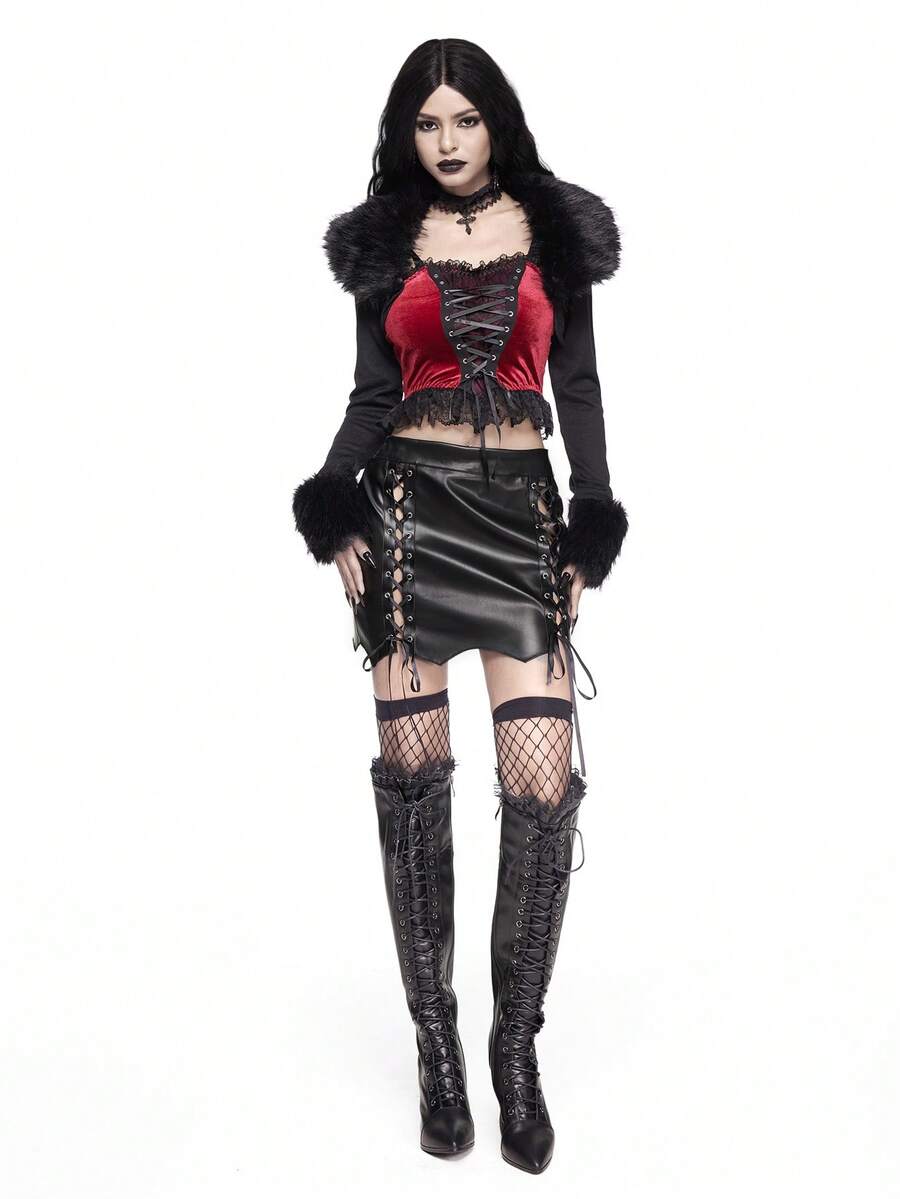 Goth Christmas Leather Metal Hollow Out Lace-Up Bat Hem Women Low Waist Tight Fit Mini Skirt