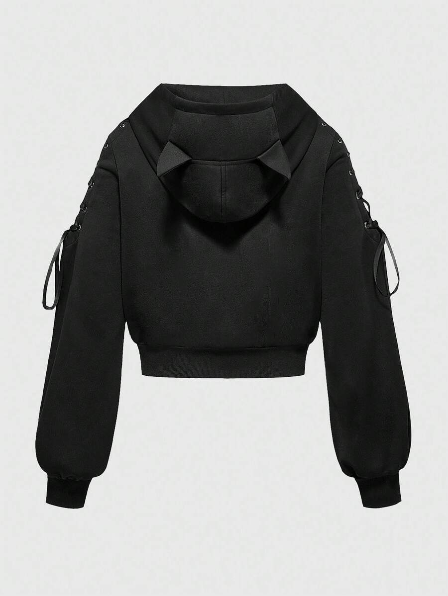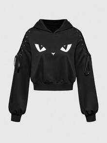 Cute Gothic Halloween Cat Ear Decor Shoulder Strap Decor Cat Expression Print Women Short Pullover Sweatshirt