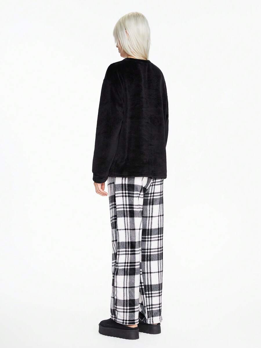 Goth Darkwear Halloween Skeleton Embroidery Double Sided Fleece Long Sleeve Pajama Set, Warm And Casual For Fall/Winter