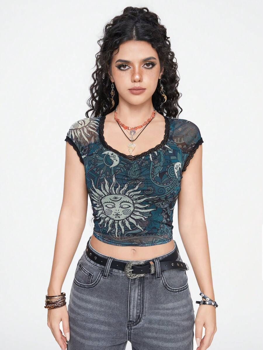 Goth Elegant Lady Sun, Moon, Stars, And Hippie Net Print Lace Edge Short Sleeve Raglan Sleeve Low Neck Stretchy Women's T-Shirt