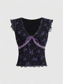 Goth Floral Print Contrast Lace Tie Front Mesh Top