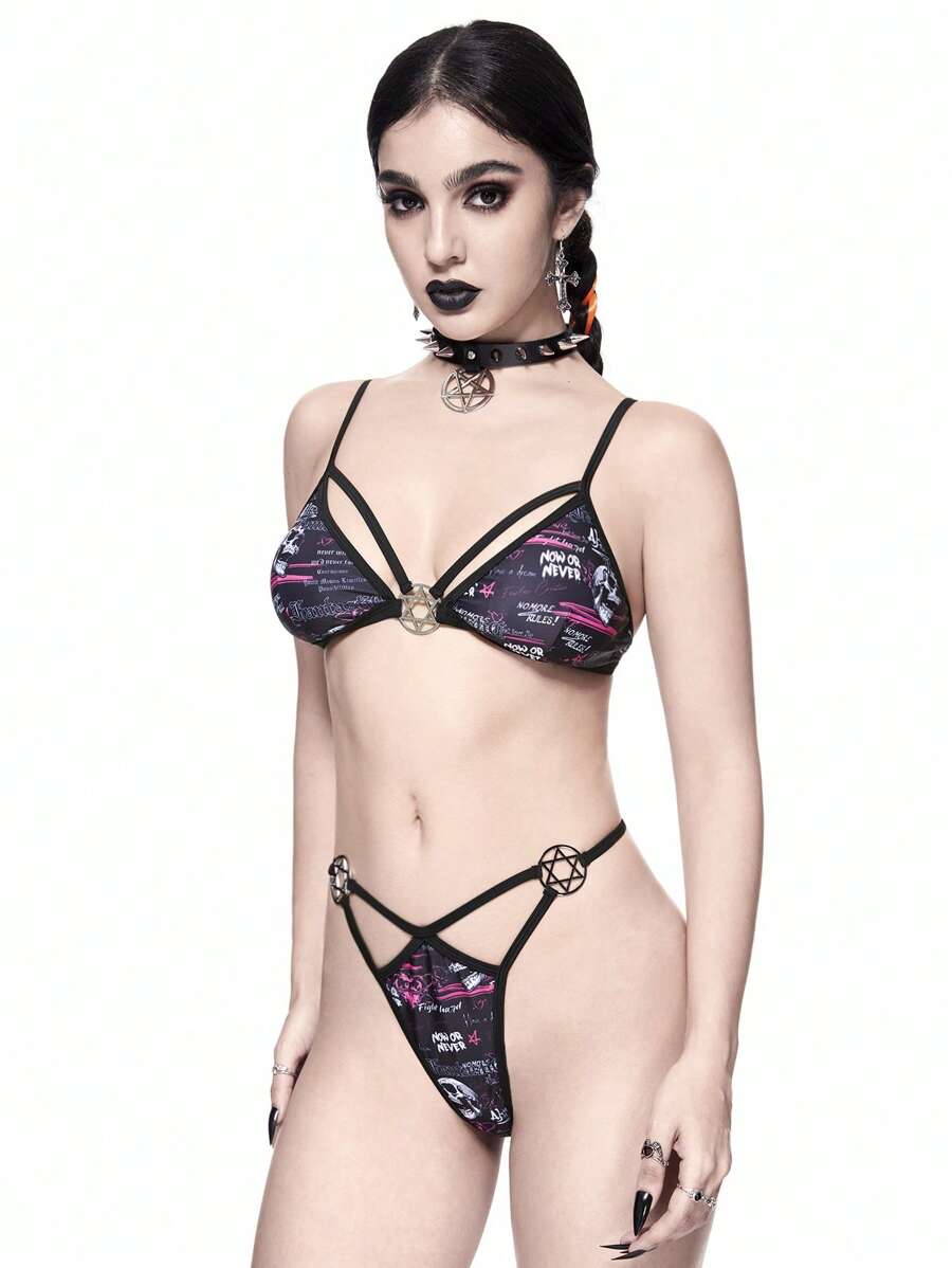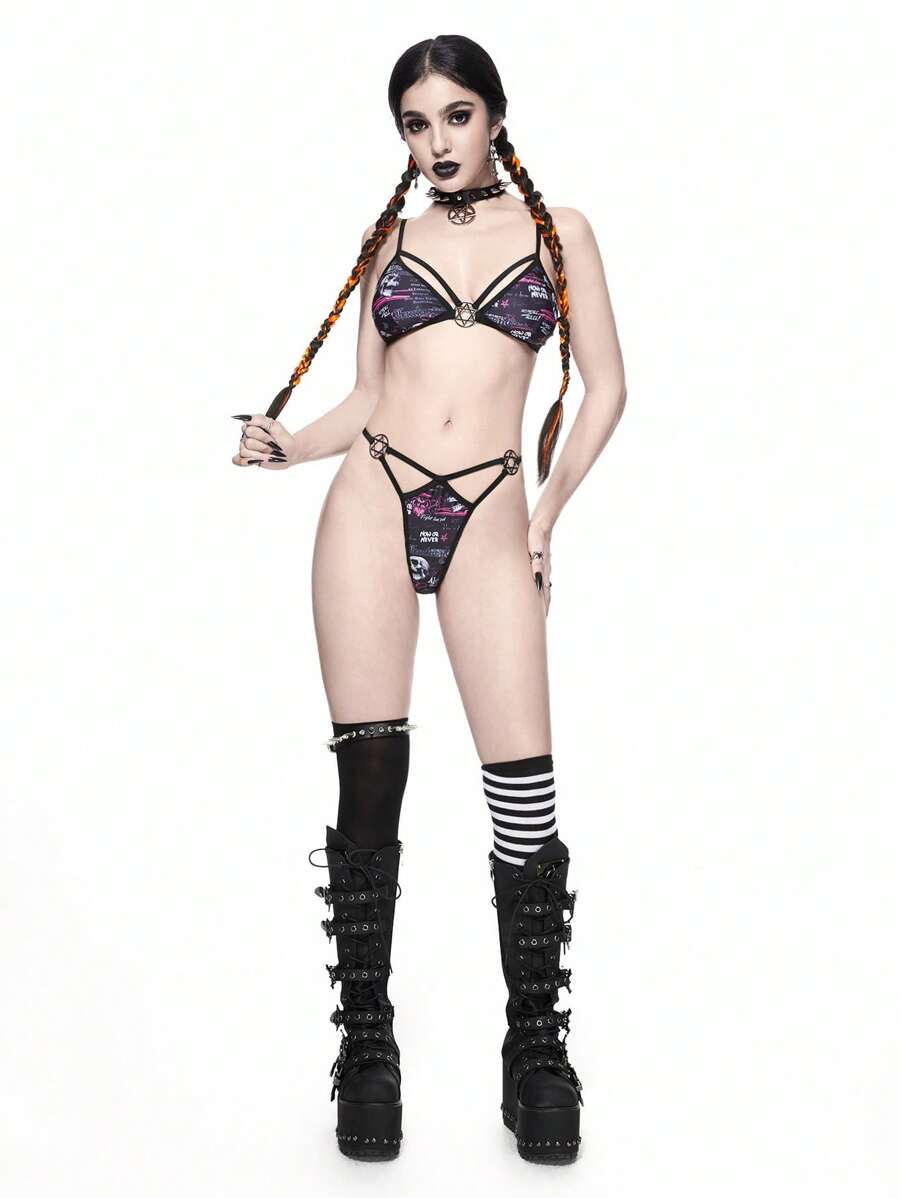 Goth Floral Print Harness Triangle Cut Out Beach Bikini Set, Halloween