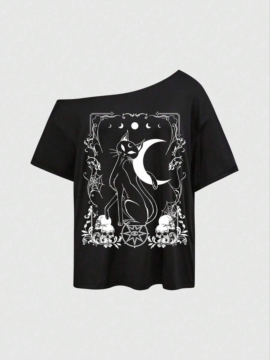 Gothic Cat Mysterious Dark Vine Sexy Asymmetrical Shoulder Black Solid Basic Vintage Plus Size Asymmetrical Shoulder T-Shirt, Summer