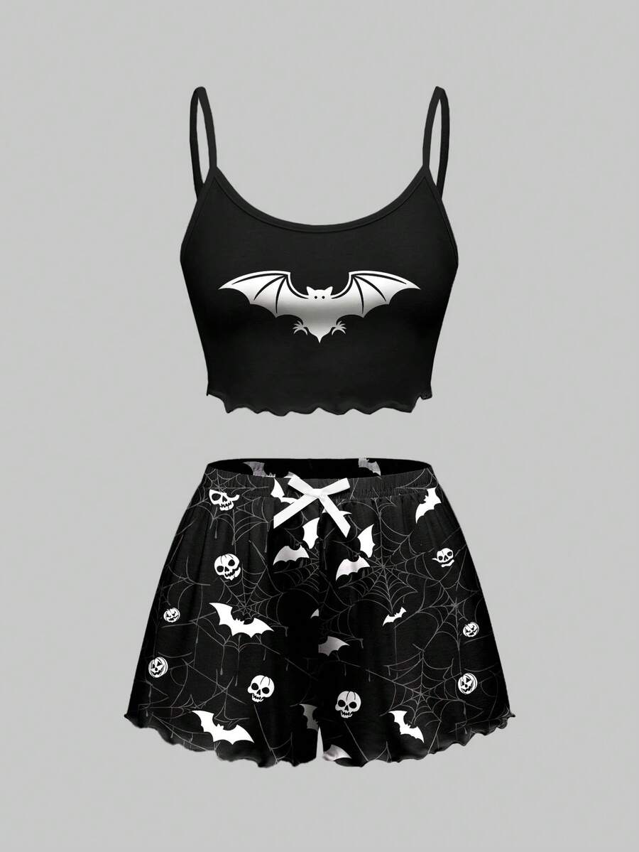 Goth Gothic Dark Halloween Bat Print Camisole & Shorts Pajama Set, Casual Sleepwear