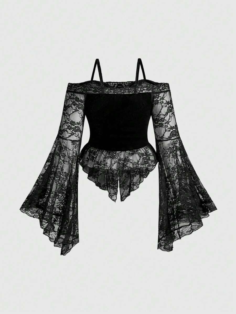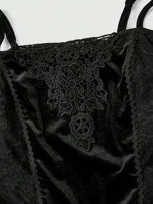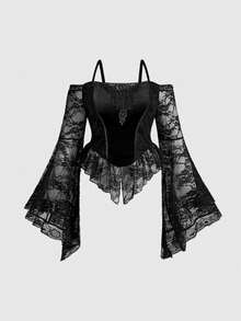Gothic Vintage Lace Patchwork Blouse For Women, Velvet & Lace Patchwork Retro Luxurious Plus Size Tops, Black Blouse For Christmas Party & Gathering