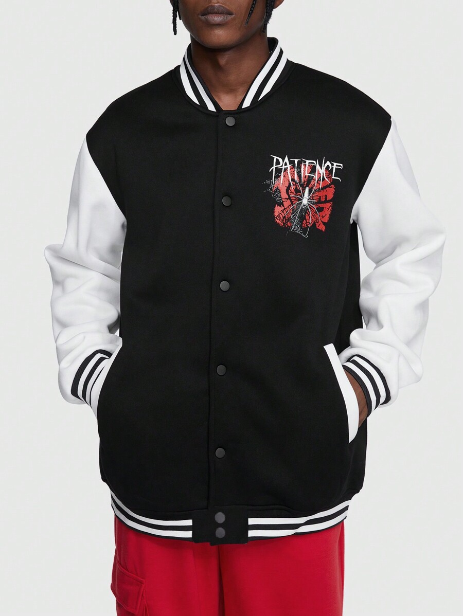 Goth Guys Letter & Spider Print Two Tone Striped Trim Varsity Jacket
