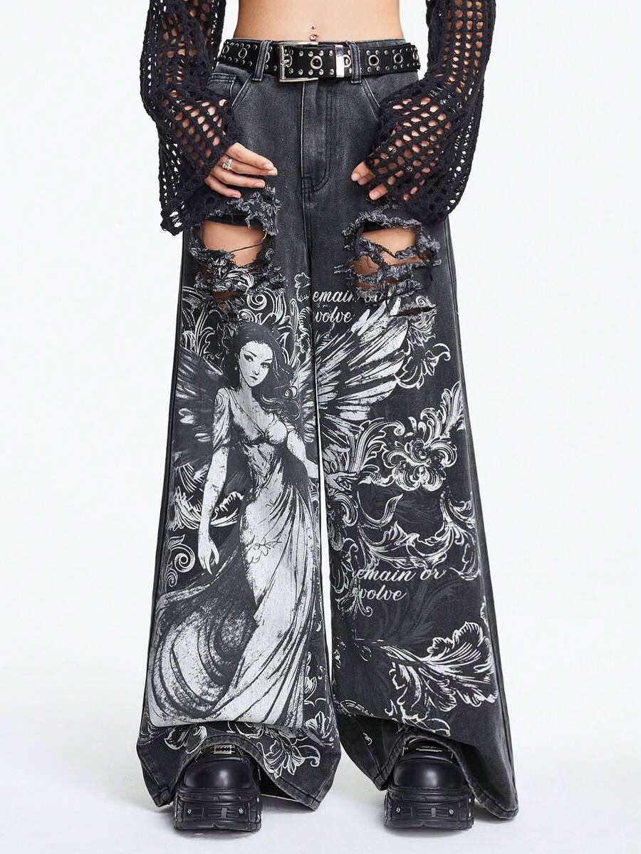 Goth Jeans With Character Print And Distressed Holes Design, School