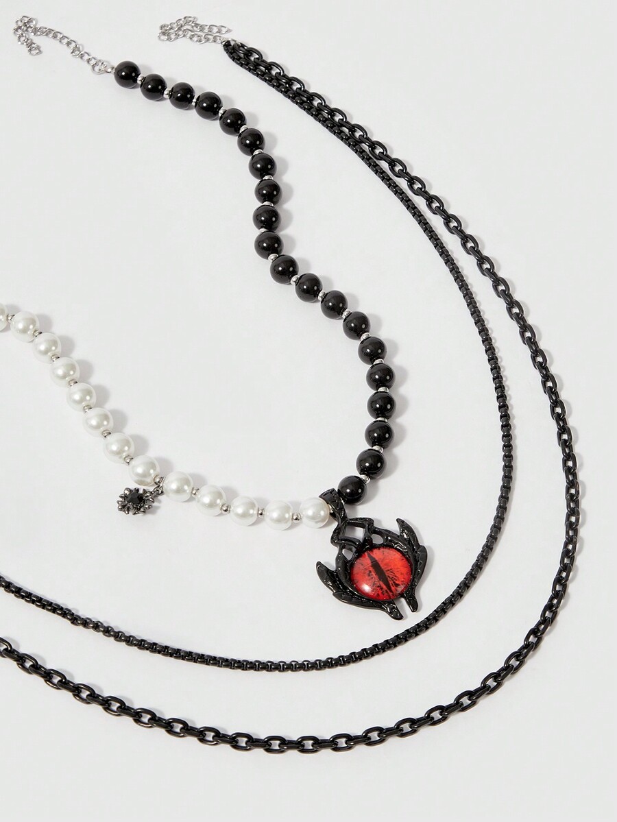 Goth Layered Pearl Demon Eye Chain Necklace, Unique Design
