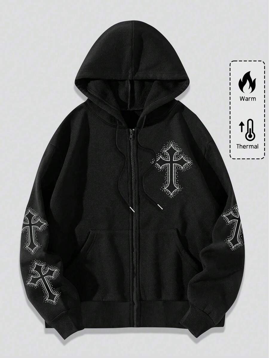 Goth Men Cross Print Zip Up Drawstring Thermal Hooded Sweatshirt, School, For Fall Winter
