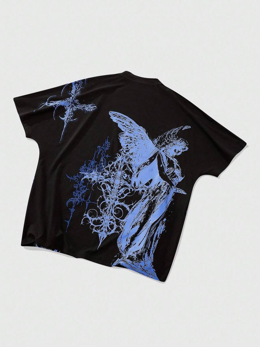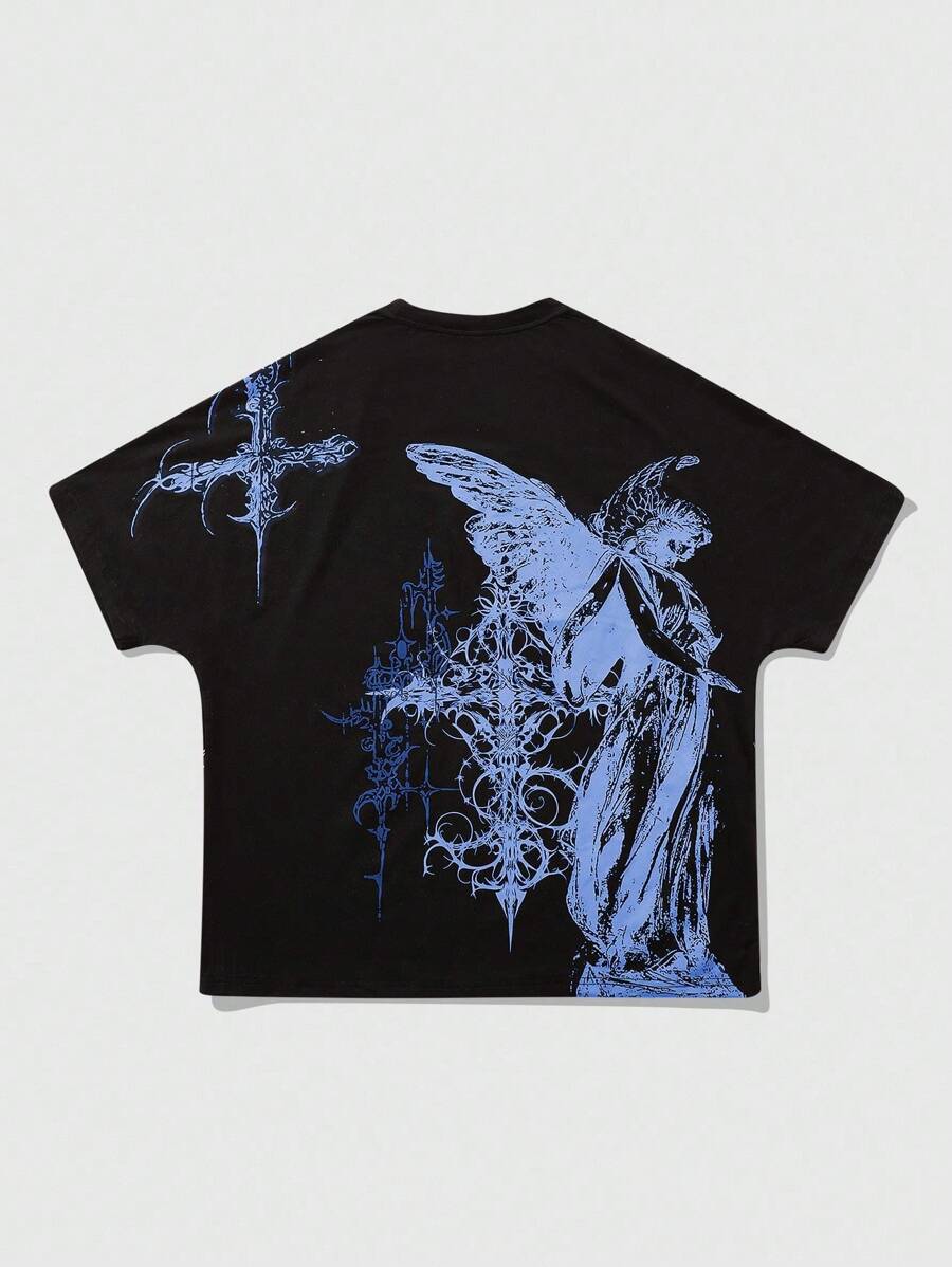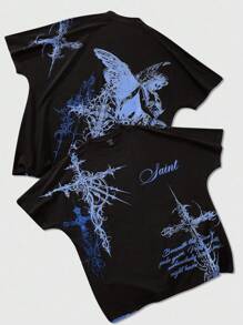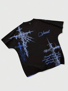 Goth Men's Batwing Sleeve Cross Printed Short Sleeve T-Shirt, Halloween, 2000s Style