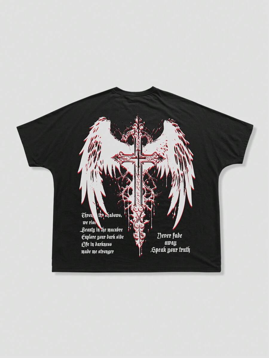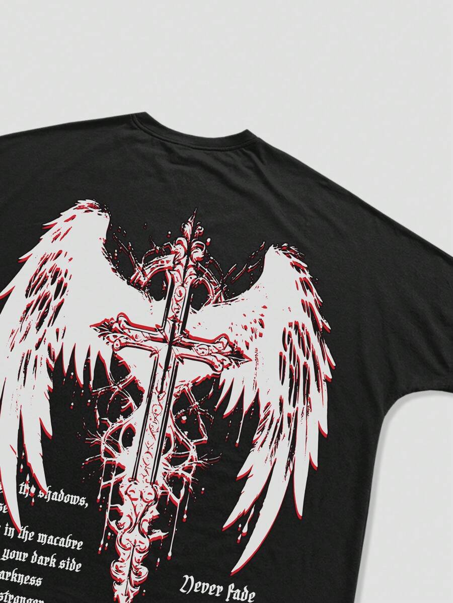 Anime Men's Casual Round Neck Short Sleeve Wing & Cross Printed T-Shirt, Simple And Everyday Wear