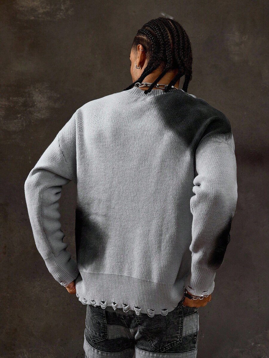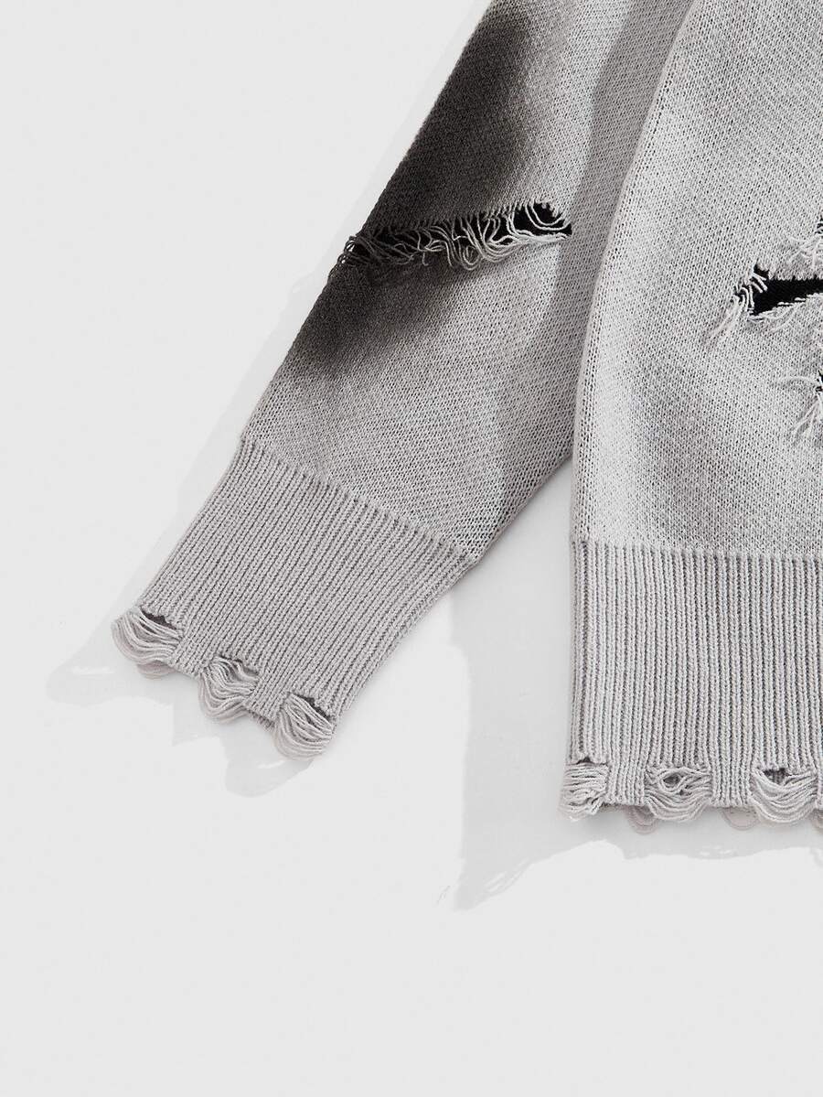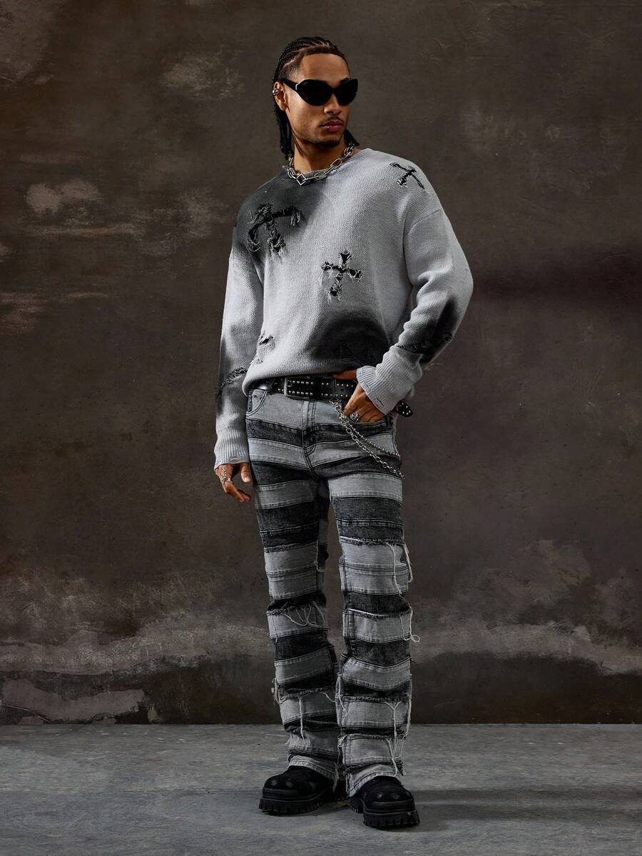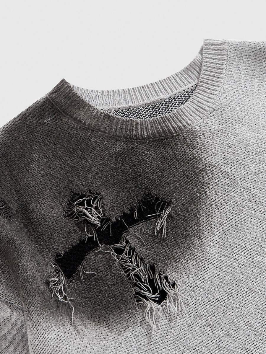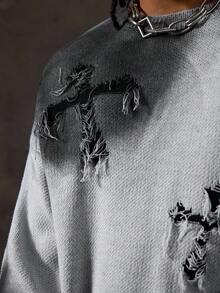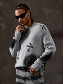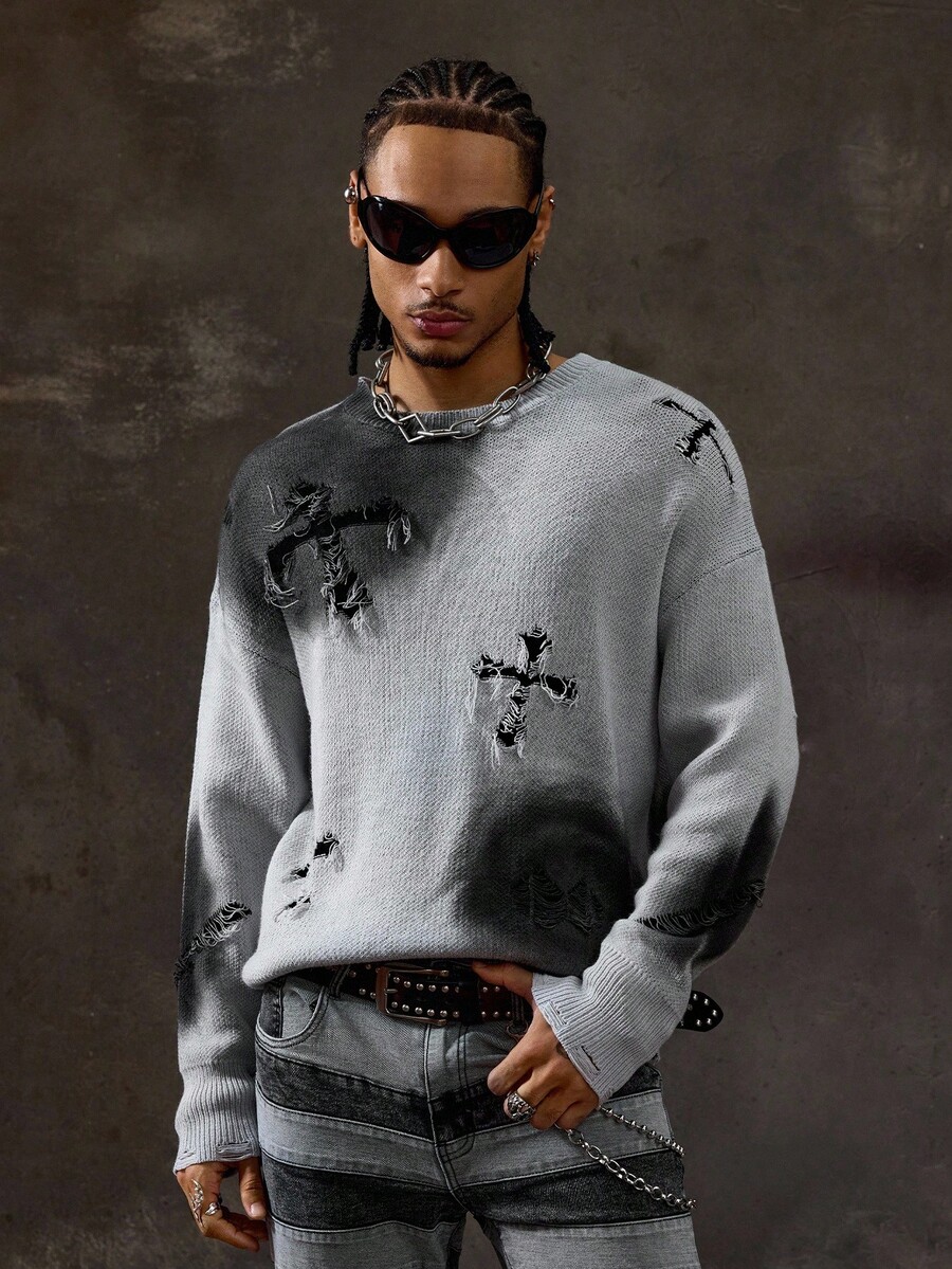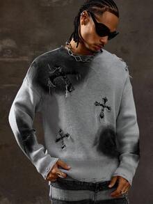 Goth Men's Cross Distressed Crew Neck Casual Sweater