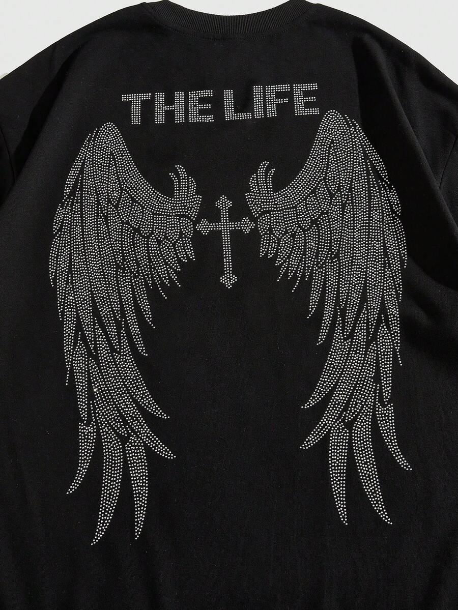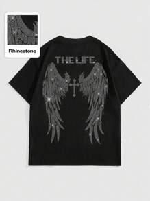 Goth Men's Cross Letter & Wings Rhinestone Decor Casual Short Sleeve T-Shirt, Summer