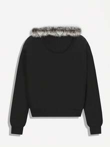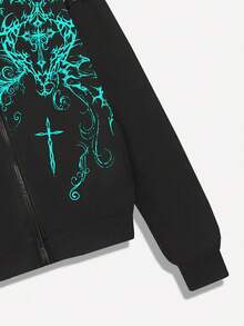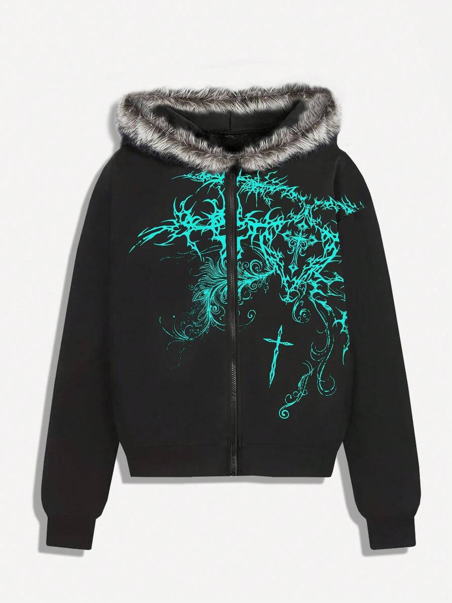 Goth Men's Cross Print Zip-Up Patchwork Faux Fur Hooded Casual Sweatshirt, Autumn/Winter