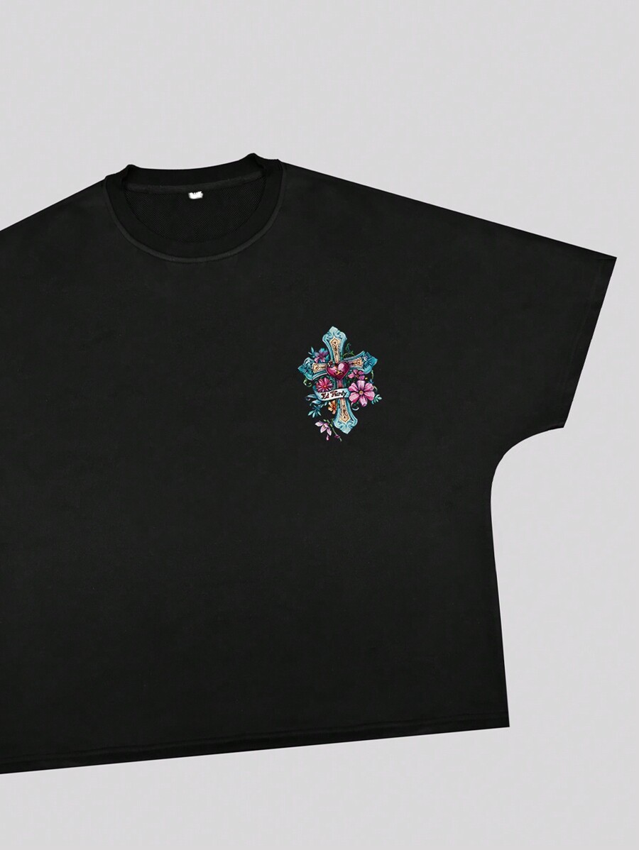 Street Life Men's Heavyweight Loose Fit Letter & Cross Print Round Neck Short Sleeve T-Shirt