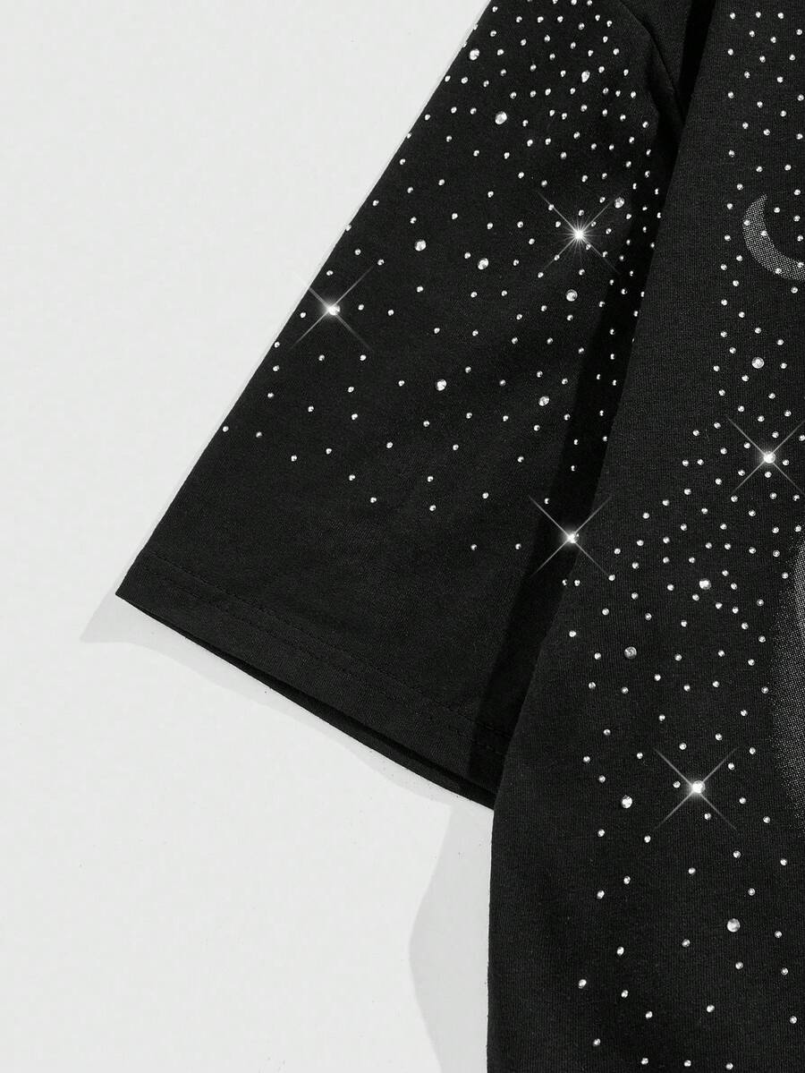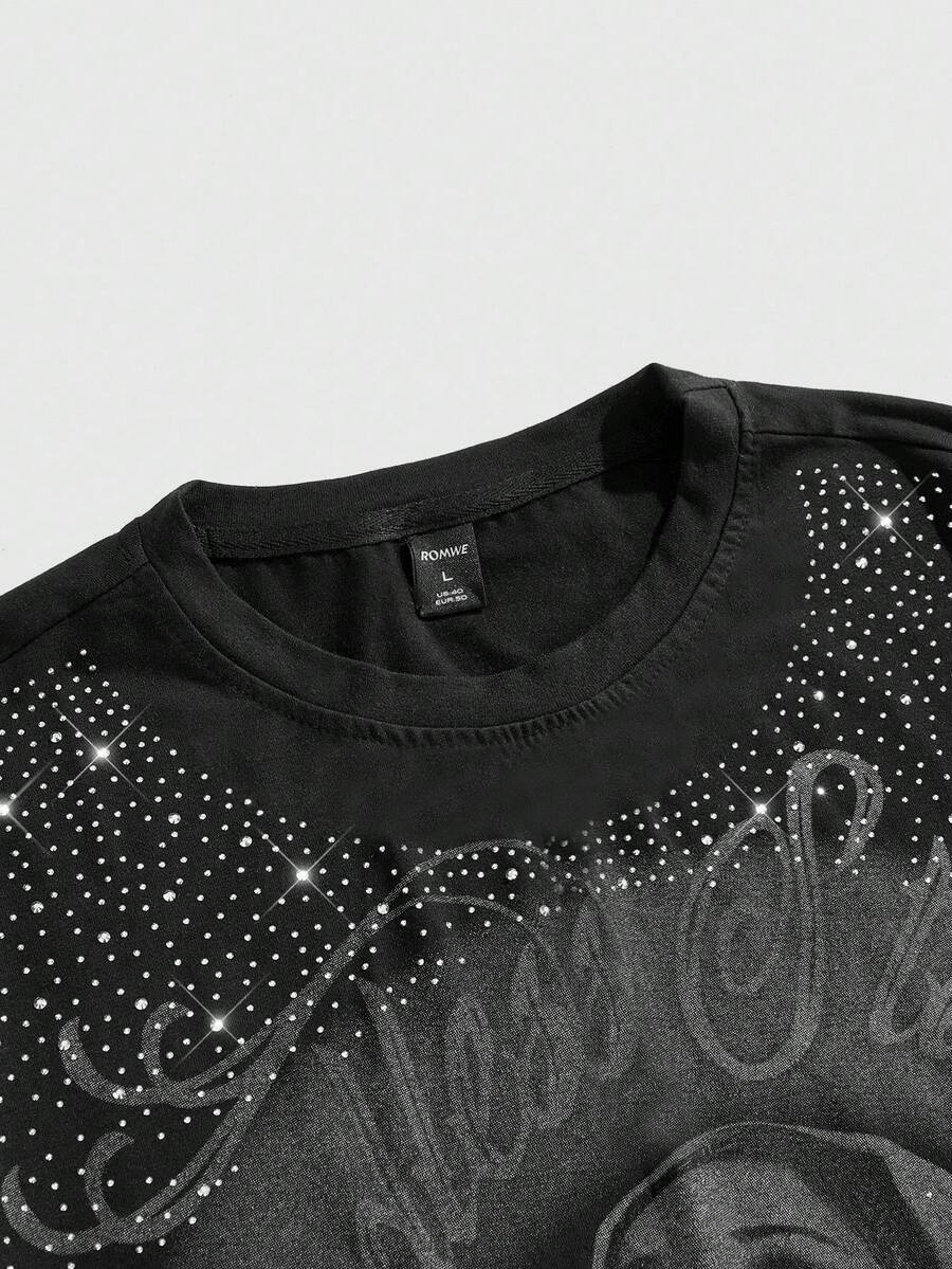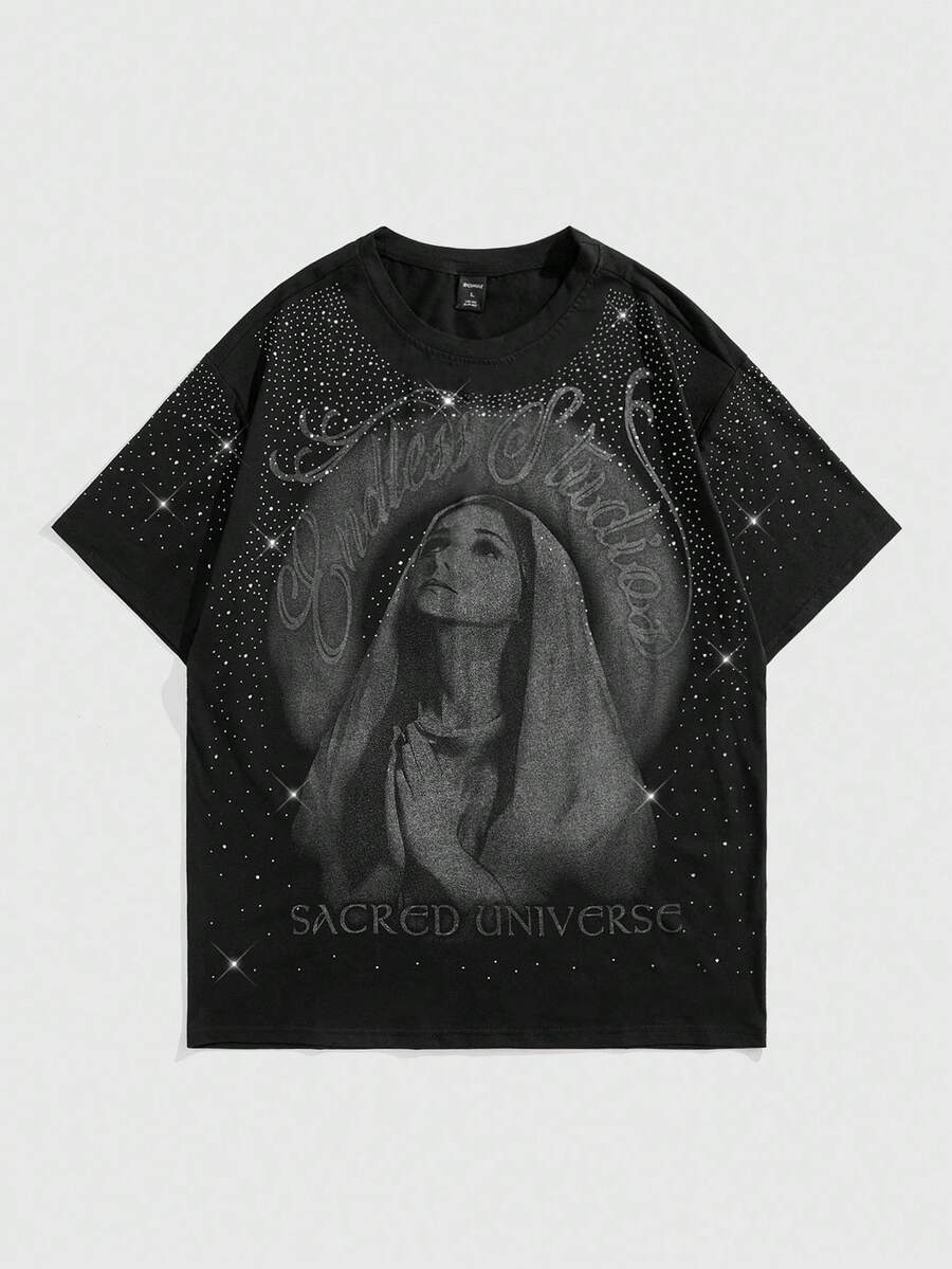 Goth Men's Saint Mother Graphic Rhinestone Embellished Short Sleeve T-Shirt, 2000s Style