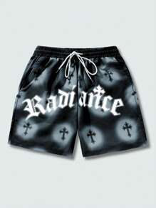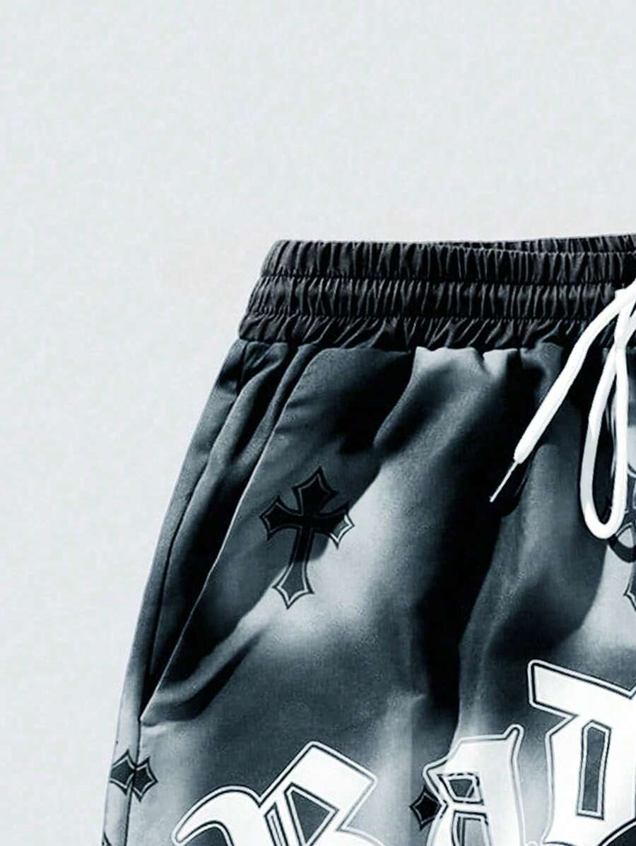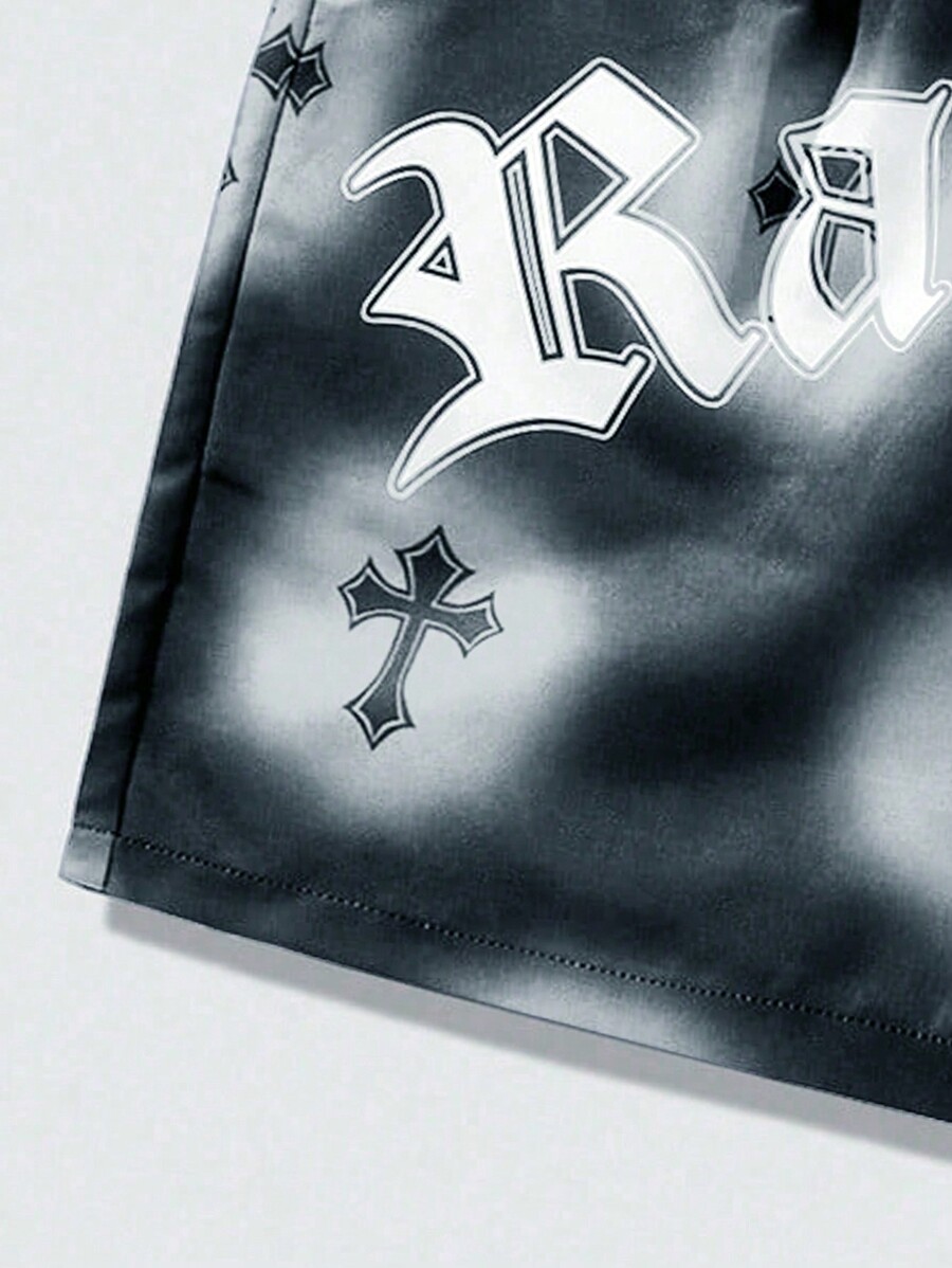 Goth Men's Slogan & Cross Print Shorts, Suitable For Daily Wear In Spring And Summer, School