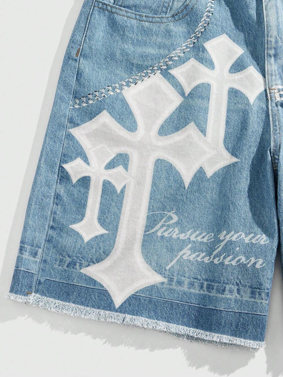 Goth Men's Summer Casual Cross Logo Printed Denim Shorts