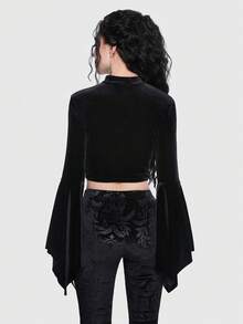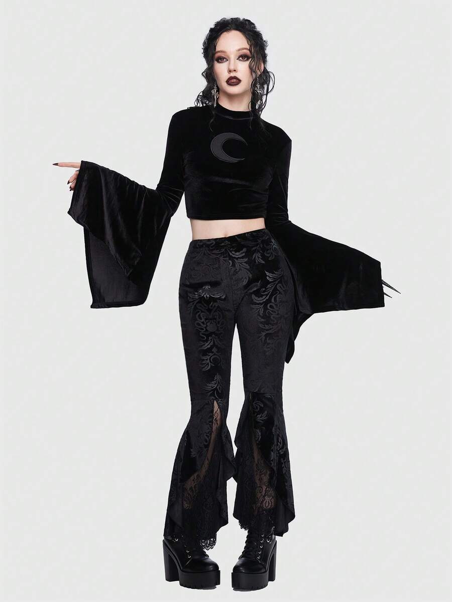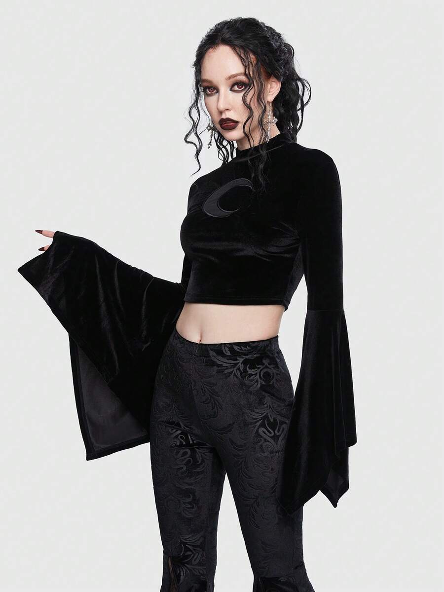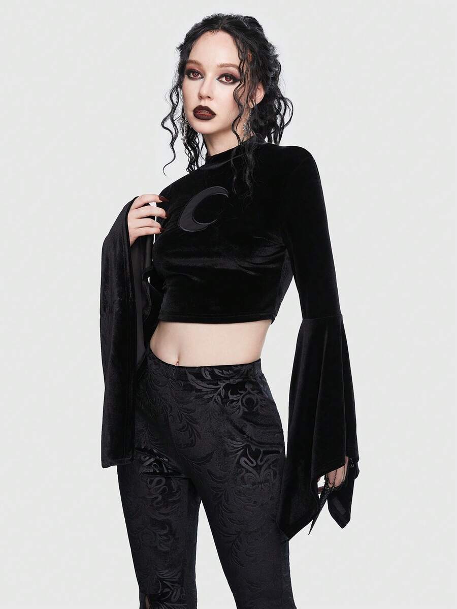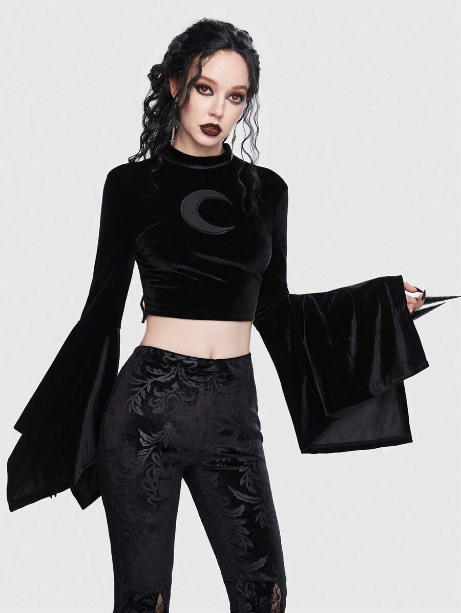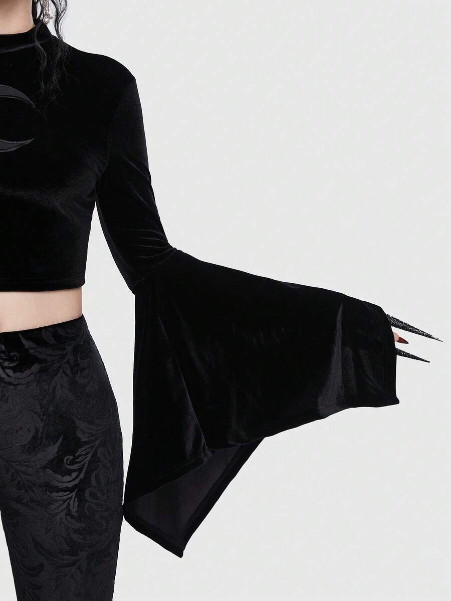 Goth Moon Print Flare Sleeve Velvet Tee