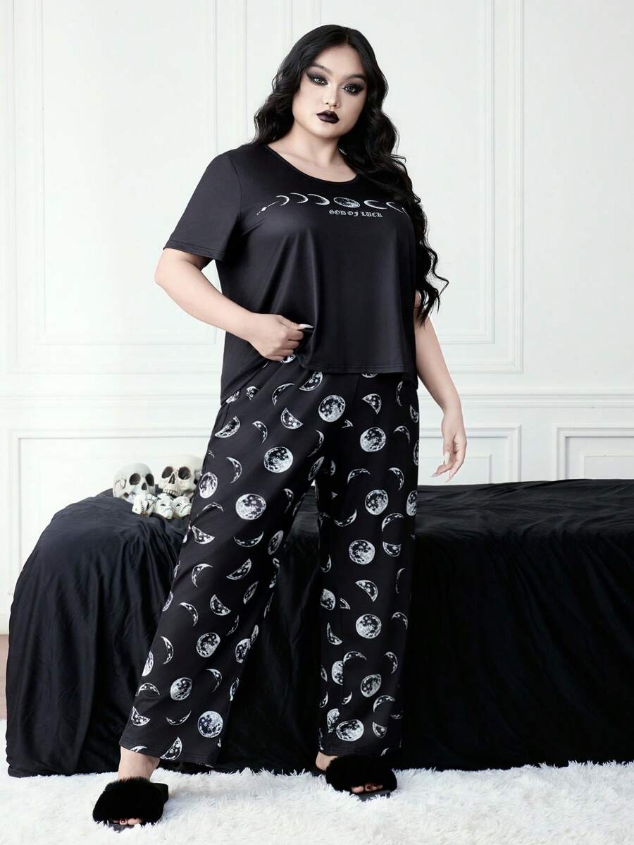 Plus Size Gothic Galaxy Print Short Sleeve & Pants Casual Pajama Set