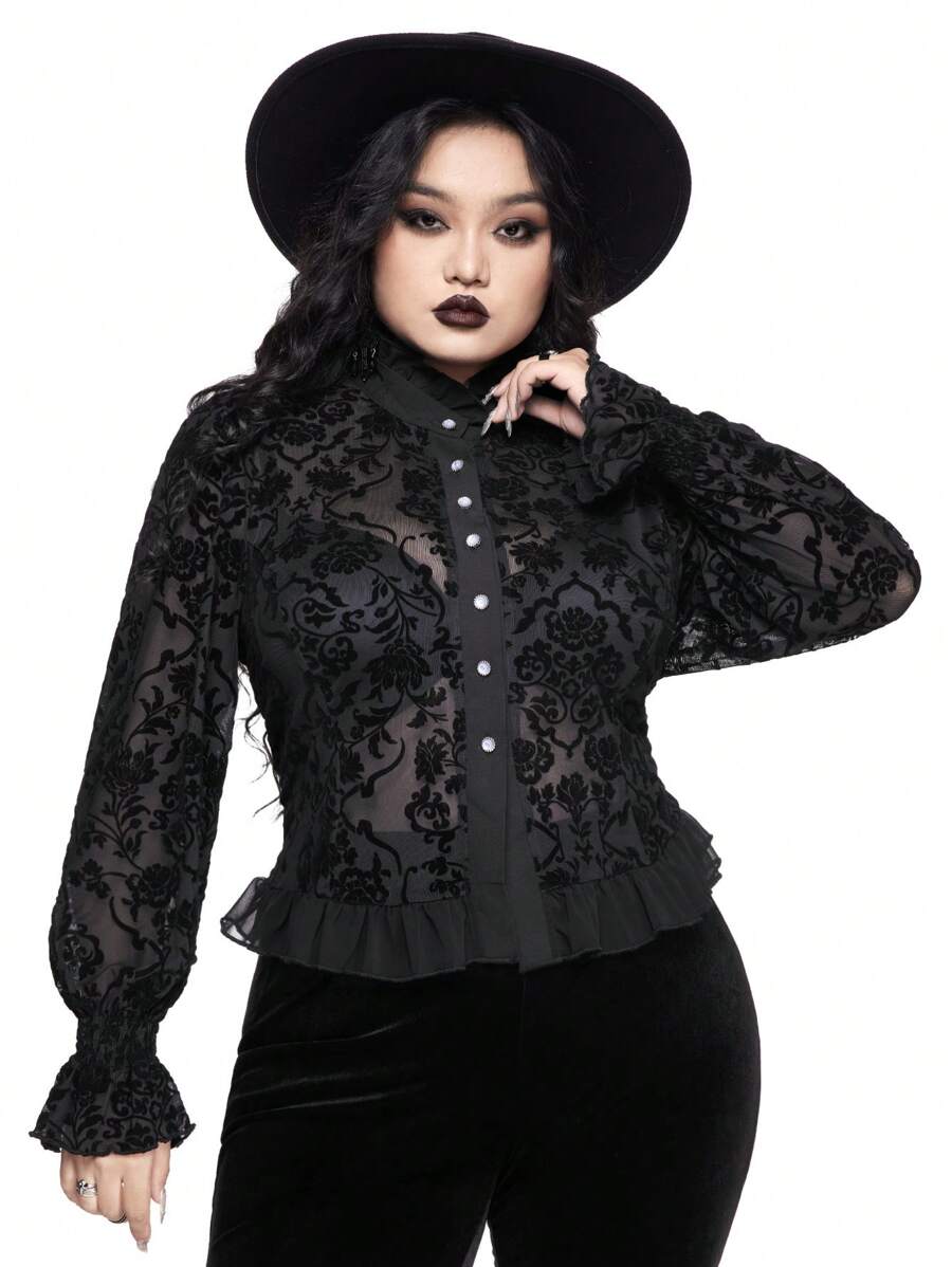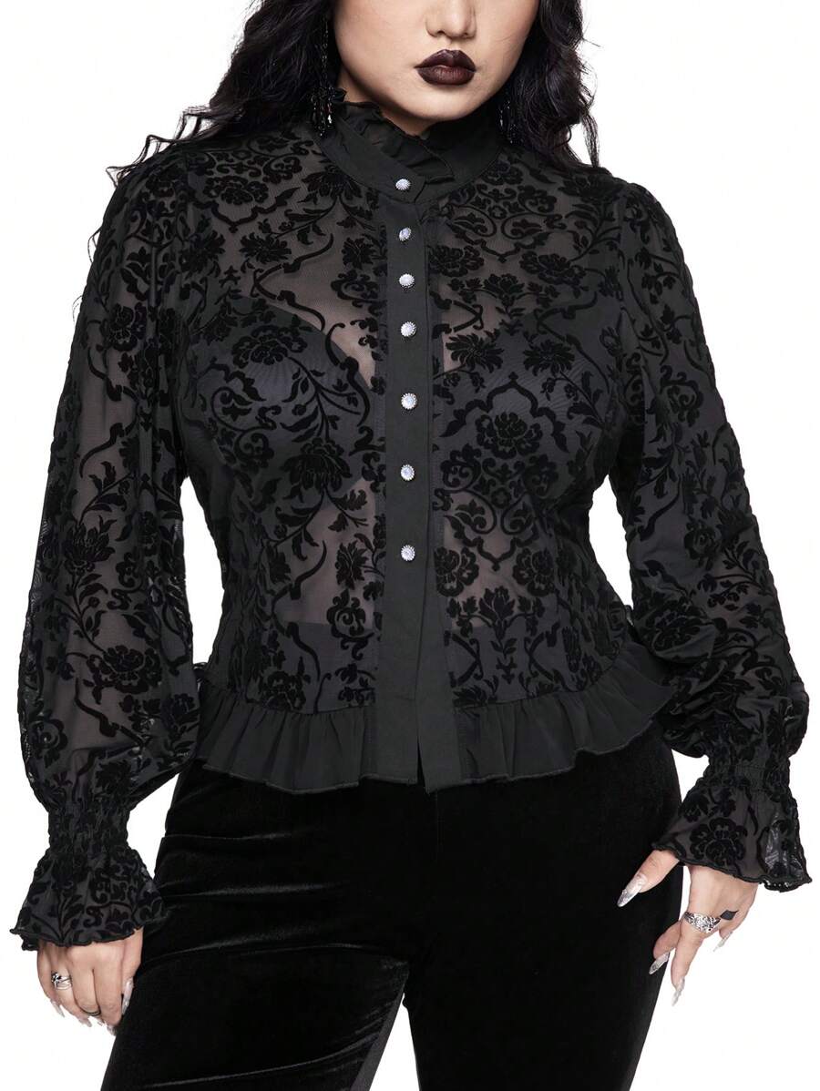 Goth Plus Size Open Front Shirt With Floral Lace Trim And Puff Sleeve, Elegant Royal Style