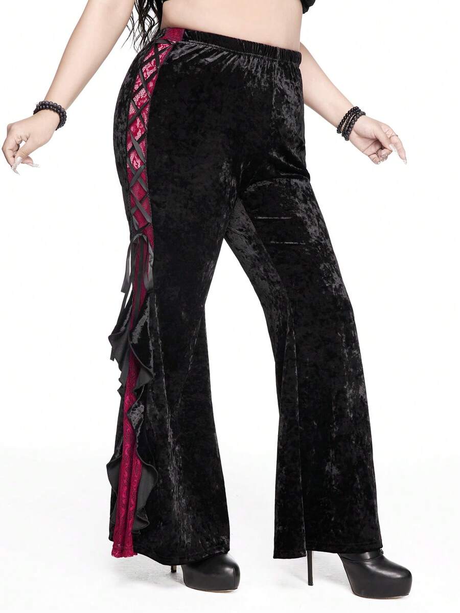 Plus Size Palace Style Goth Lady Party Contrast Lace Contrast Color Bowknot Velvet Flare Pants