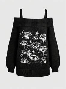 Goth Plus Size Women's Off Shoulder Vintage Eye Intarsia Pattern Loose Sweater