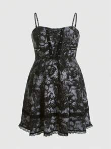 Goth Plus Skeleton Print Lace Up Front Cami Dress