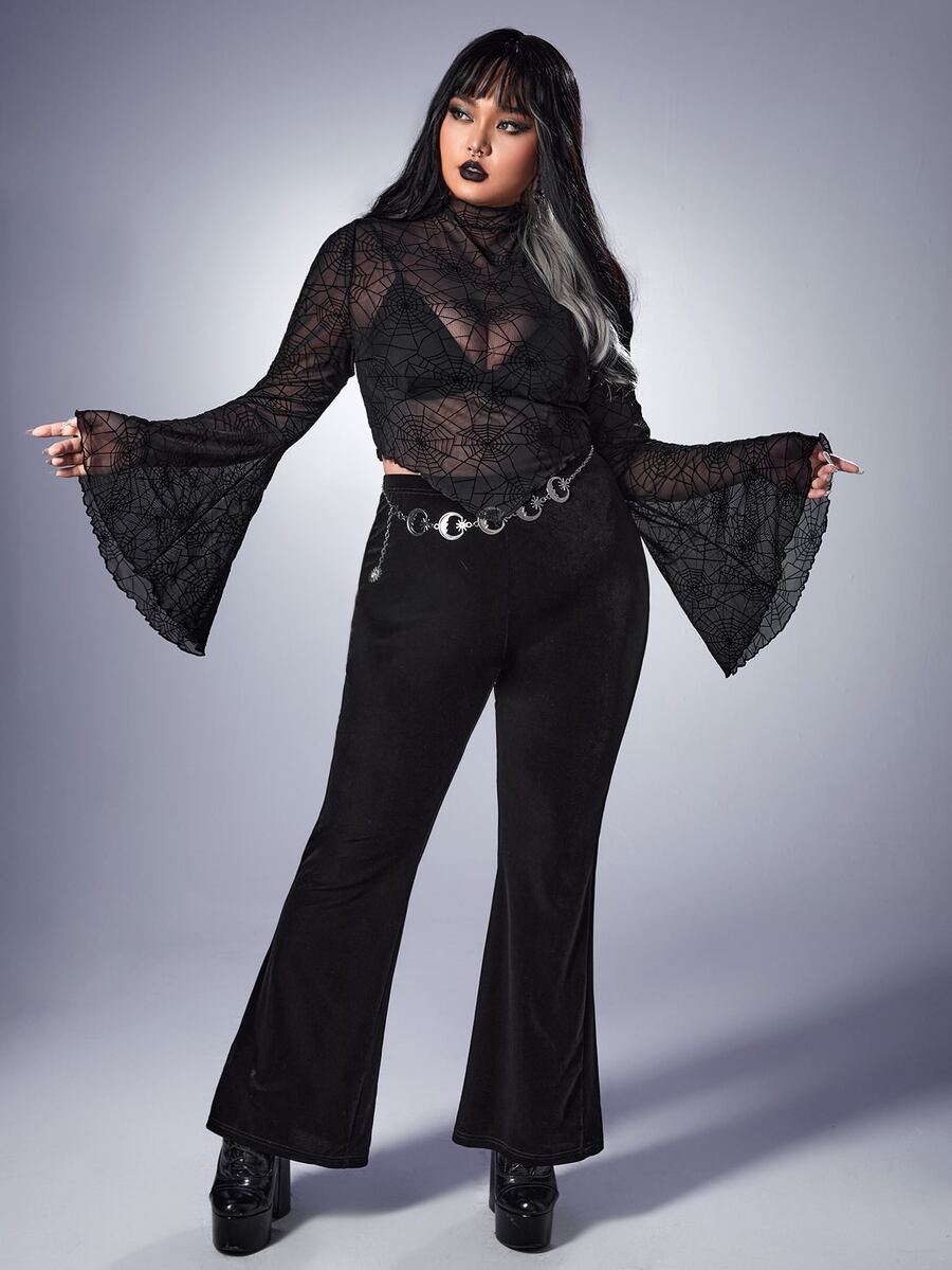 Goth Plus Spider-web Print Flounce Sleeve Mock Neck Mesh Top
