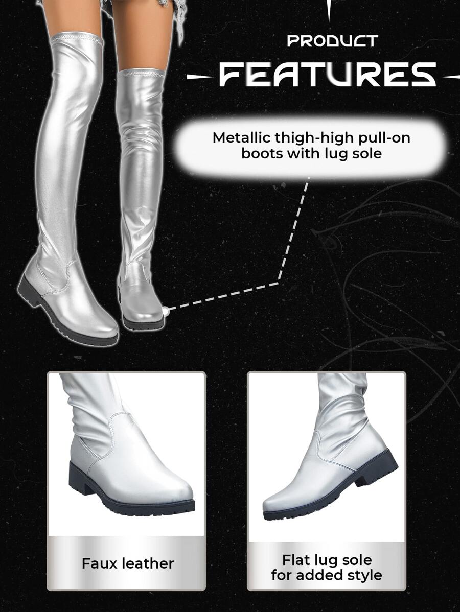 Goth Punk Party Silver Patent Leather Pointed Toe Flat Thigh-High Boots For Christmas And New Year Holiday Vibe Fall And Winter Valentines Spring Shoes