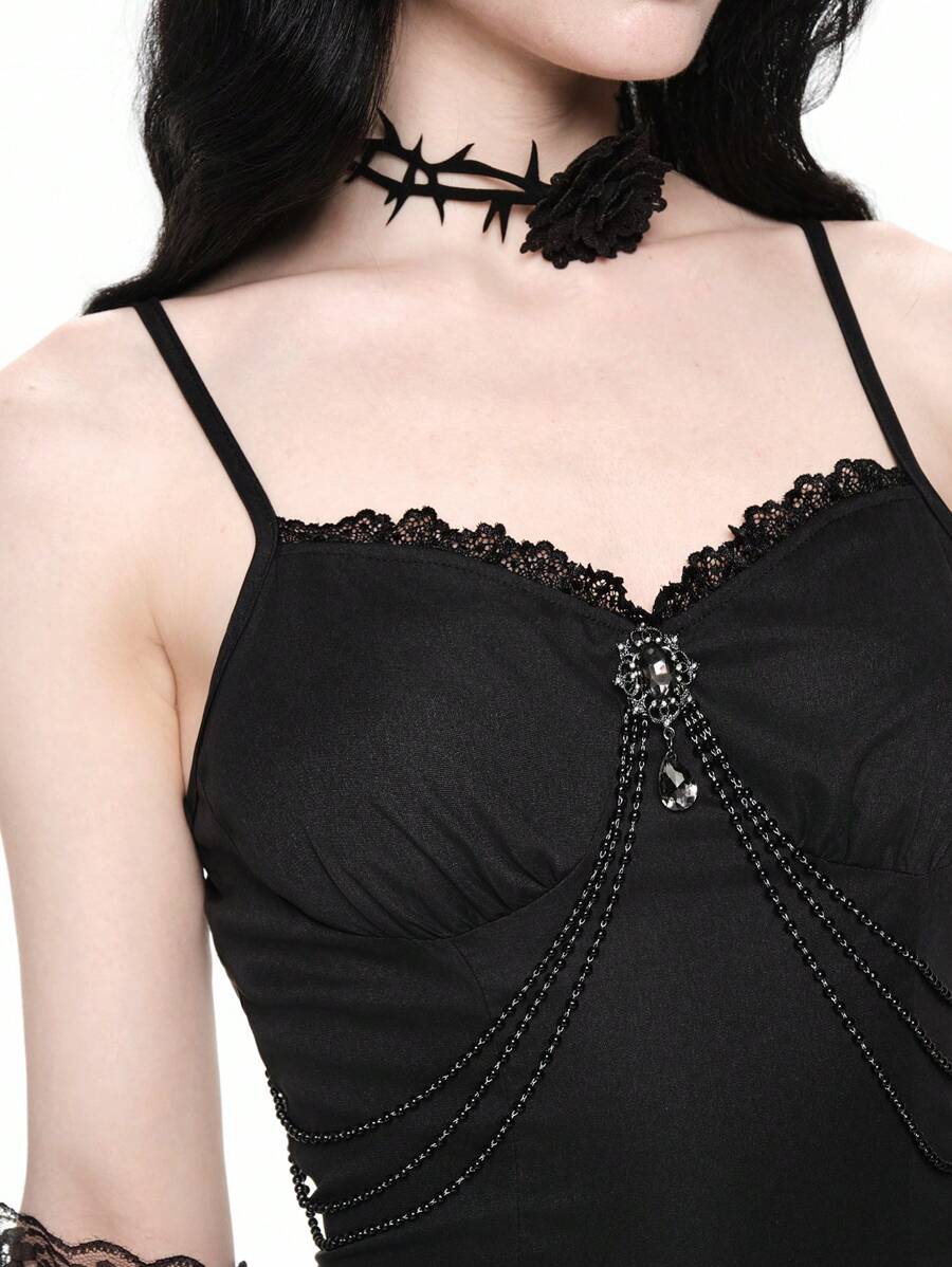 Retro Sexy Gothic Double Layered Skirt Slip Dress With Chain Pendant Decor