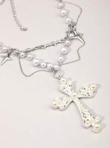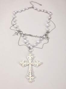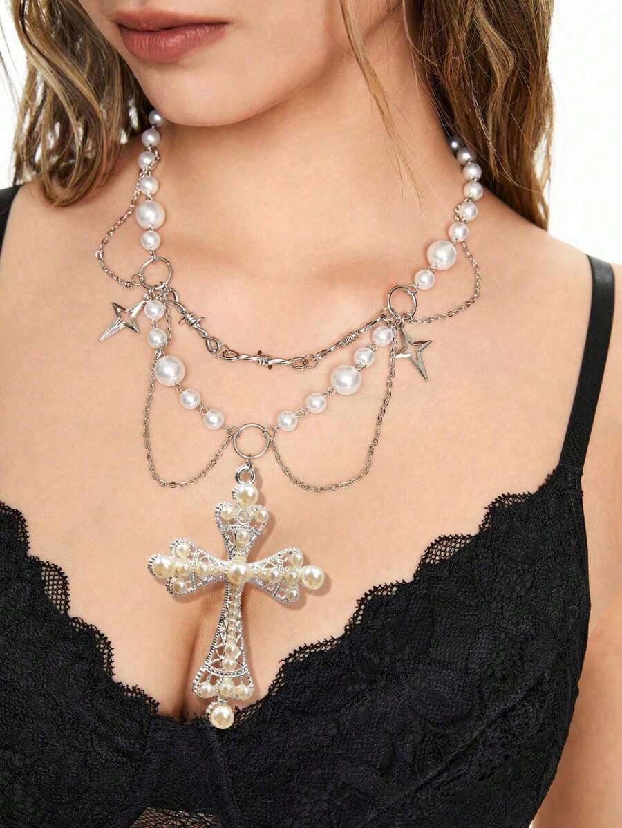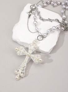 Goth Rhinestone Embellished Large Cross & Faux Pearl Multi-Layer Necklace For Women