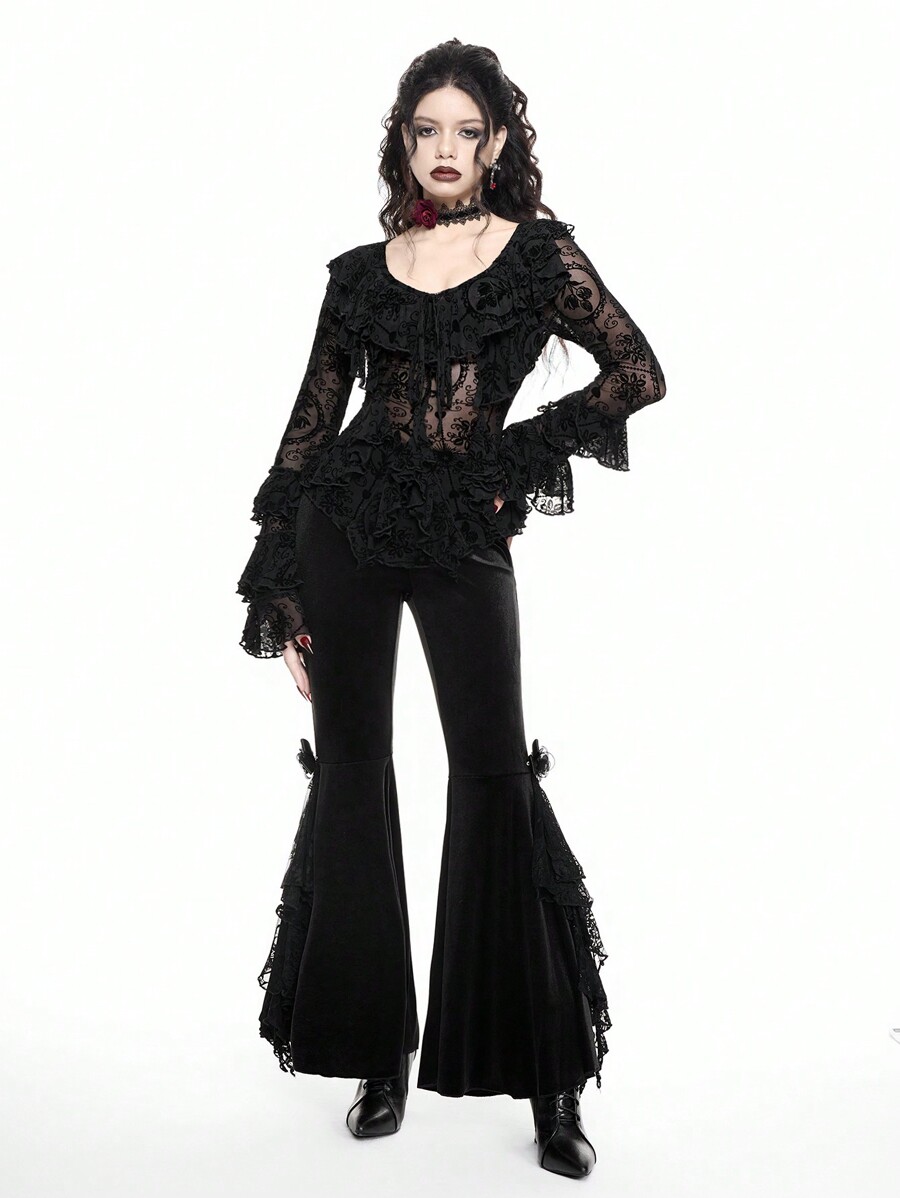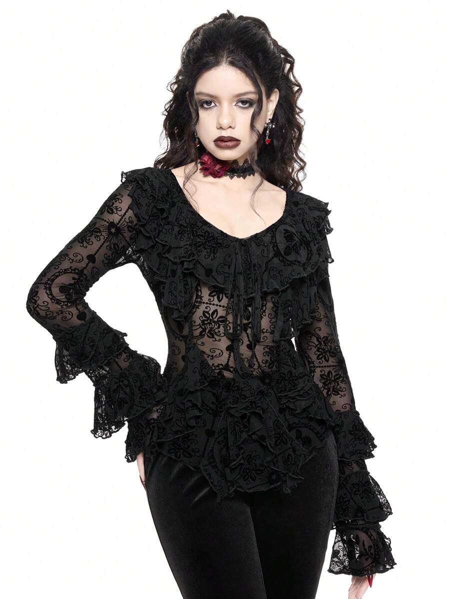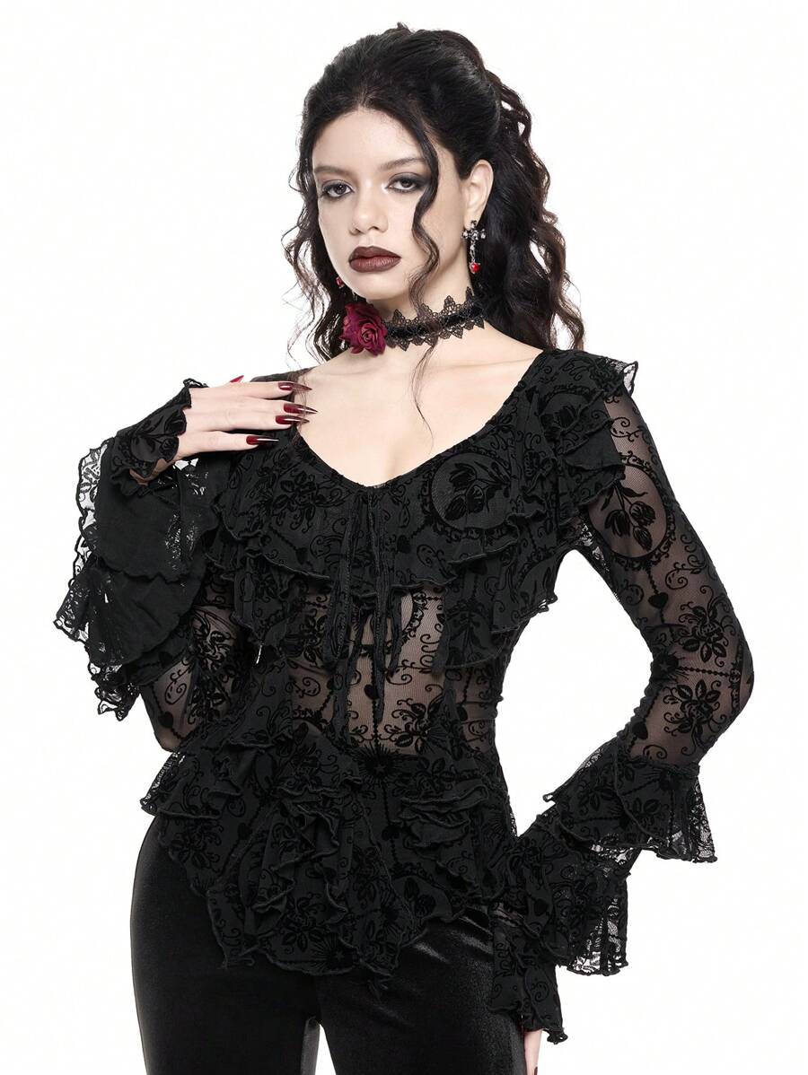 Romantic Gothic Sexy Bowknot Flare Sleeve Asymmetrical Hem Sheer Flocked Lace Blouse For Women For Valentine's Day