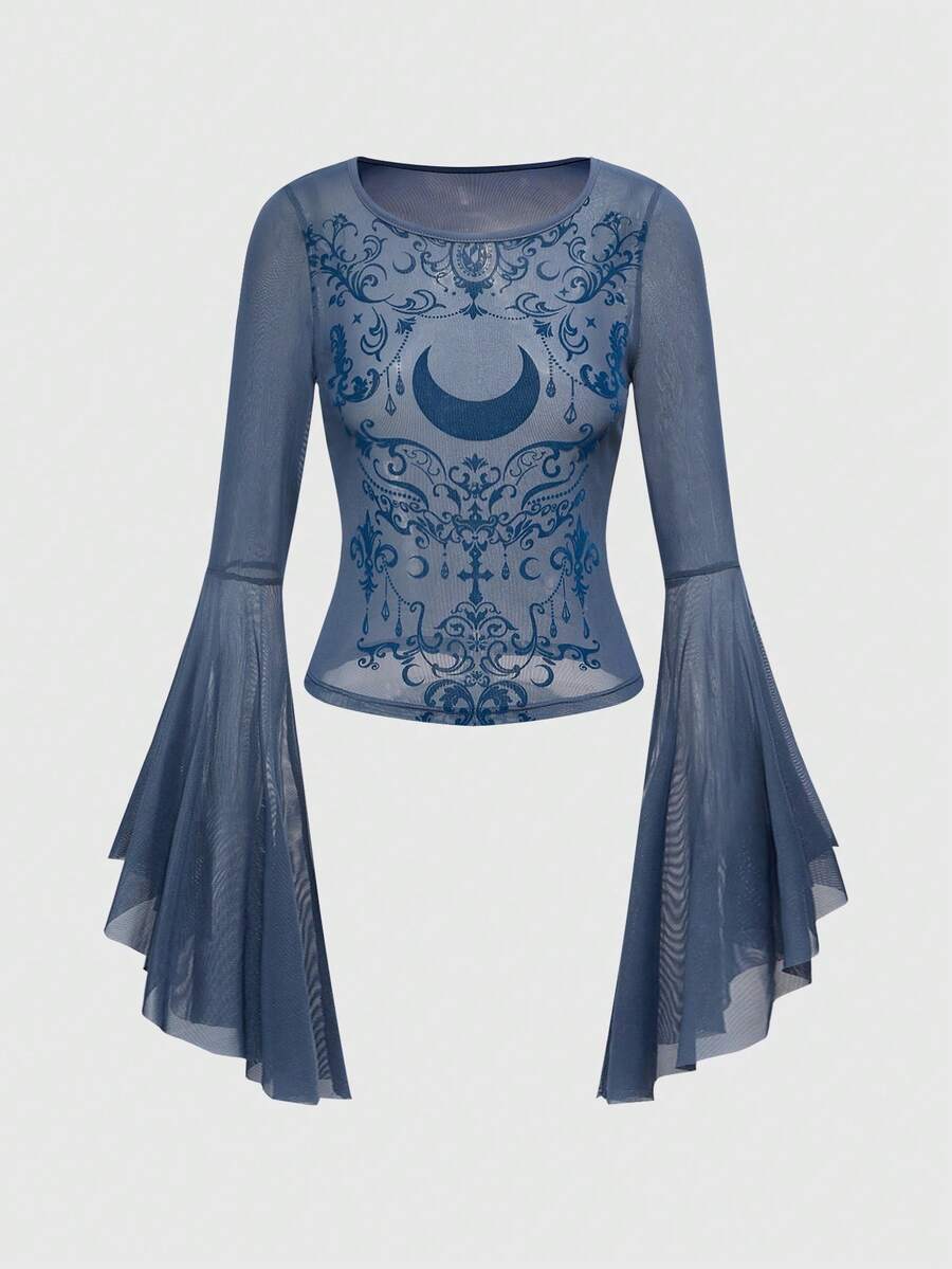 Romantic Gothic Vintage Baroque Vine & Moon Pattern Flocked Flare Sleeve