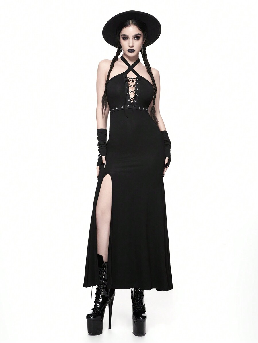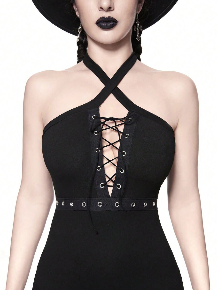 Sexy Gothic Punk Dark Style Crisscross Bow-Tie Grommet Knitted Elastic Waist Bodycon Dress