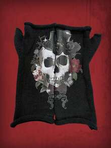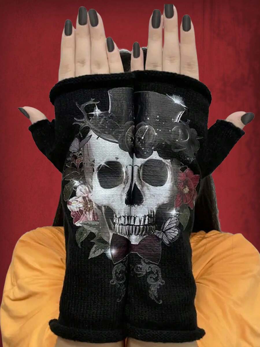 Goth Skull Beanie With Knitted Gloves & Elastic Half Finger Glove, Unisex Gift